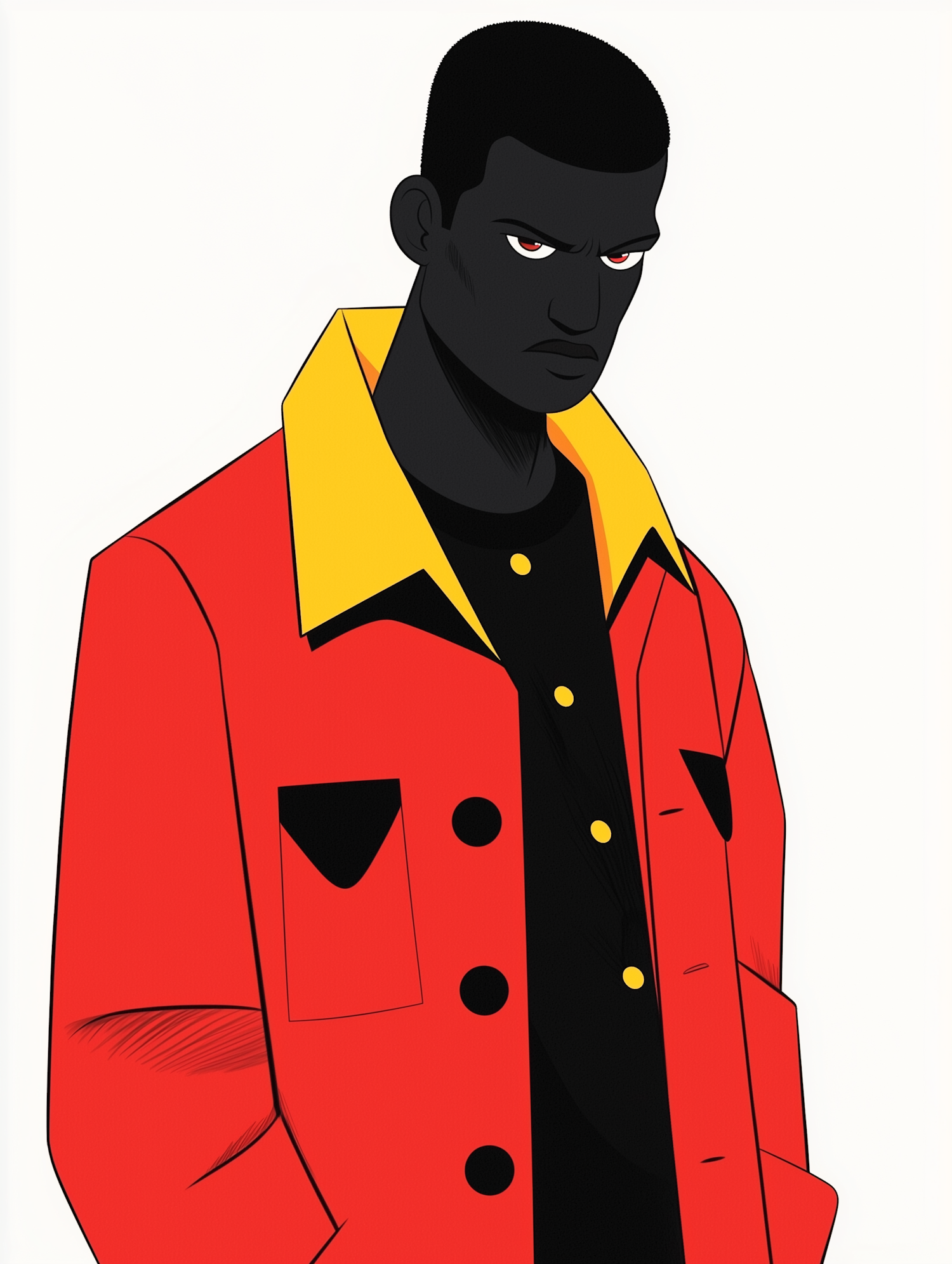 Stylized illustration of a man in a red jacket with a yellow collar, featuring a serious expression and bold colors.