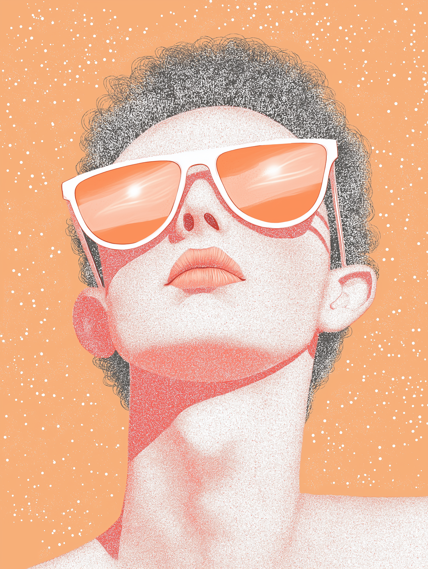 Stylized illustration of a person with curly hair and orange sunglasses, set against a vibrant orange background with white dots.