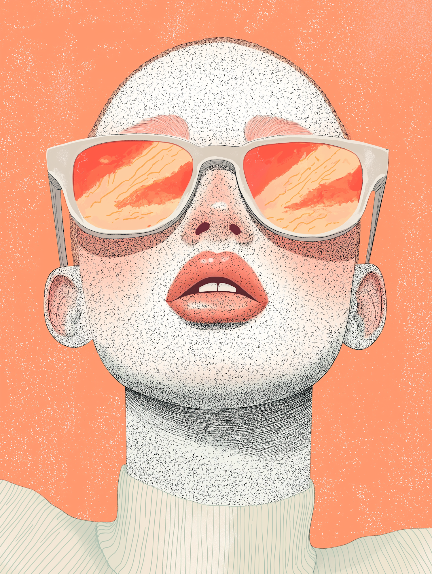 Stylized illustration of a bald figure with reflective sunglasses, coral lips, and an orange background, exuding modern artistic vibes.