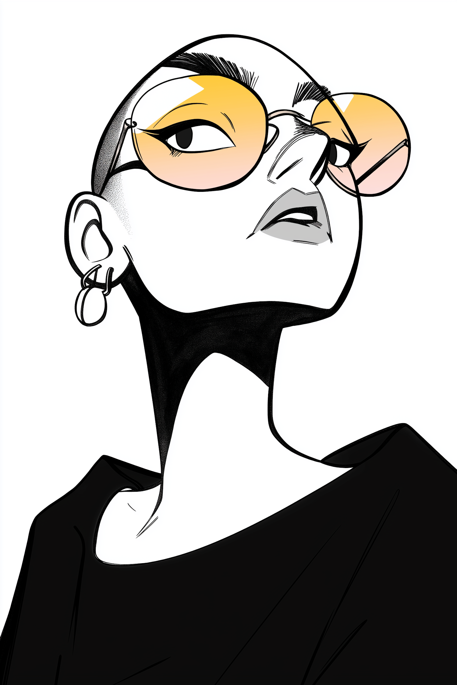 Stylized illustration of a person with shaved head, yellow sunglasses, and hoop earring, exuding confidence and attitude.