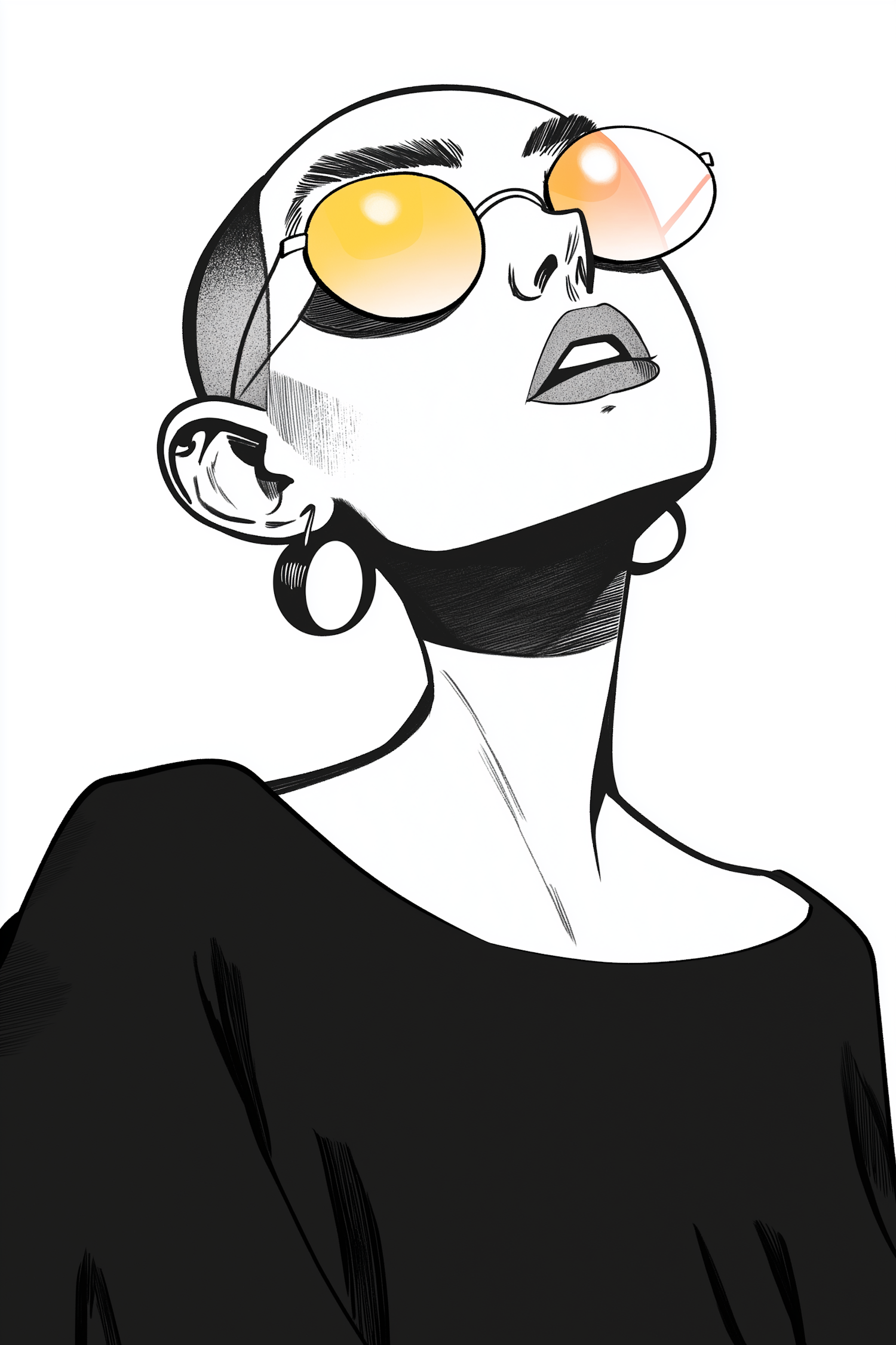 Stylized illustration of a person with shaved head, wearing yellow sunglasses and hoop earrings, exuding confidence.