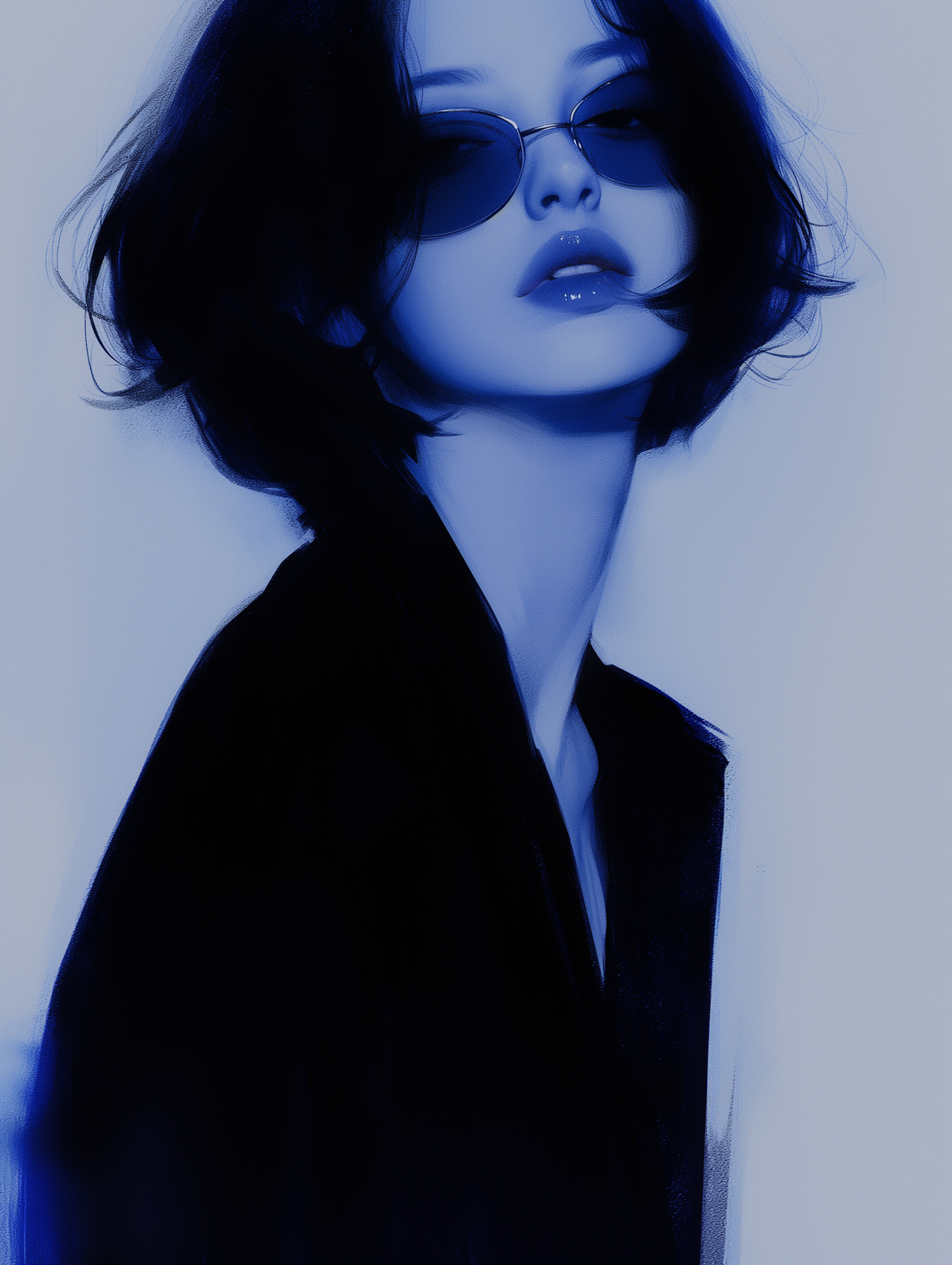 Stylized blue-toned illustration of a person with dark hair and sunglasses, exuding a mysterious and fashionable vibe.