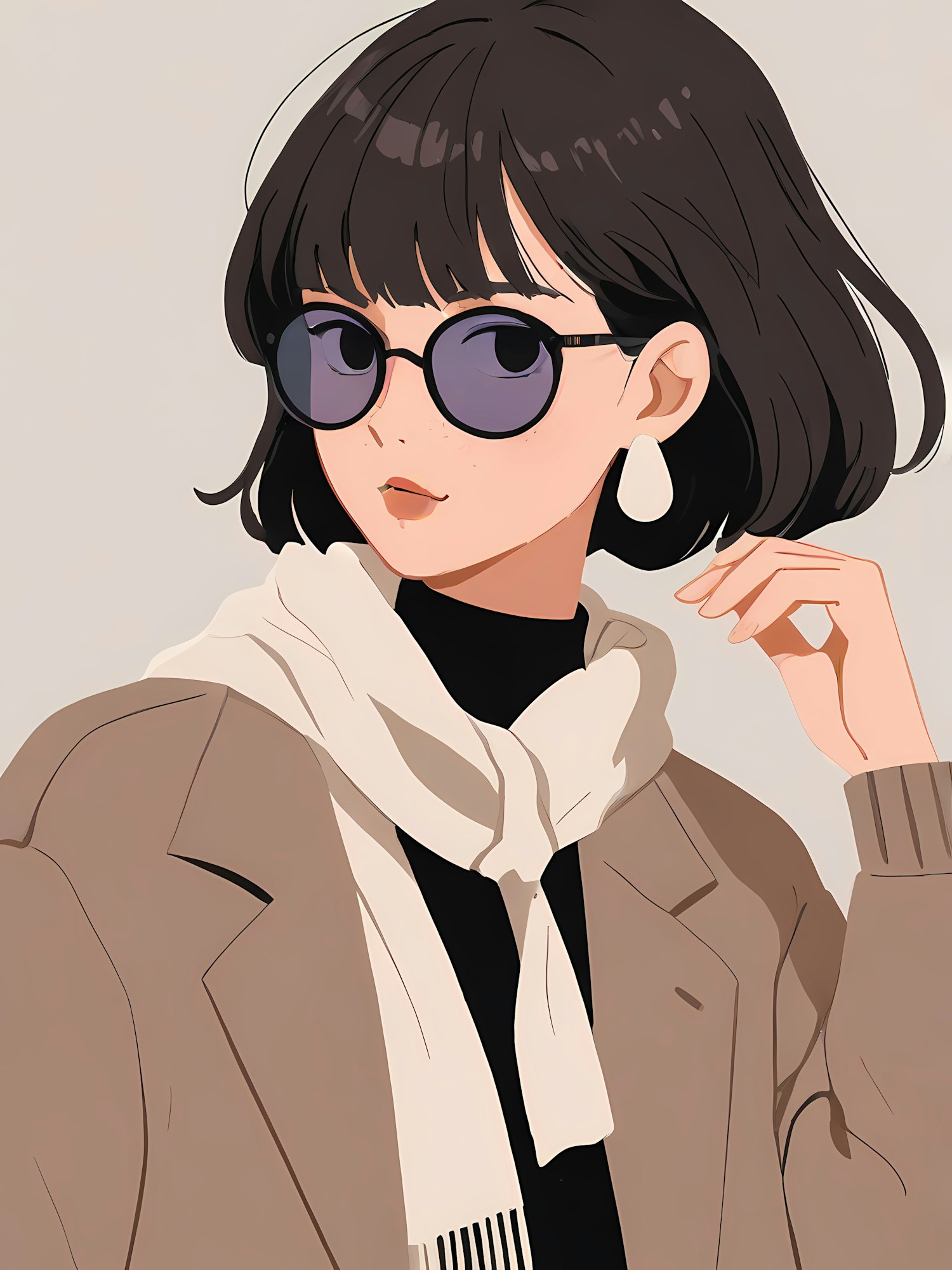 Chic illustration of a woman with short dark hair, sunglasses, beige coat, and white scarf, exuding elegance and style.