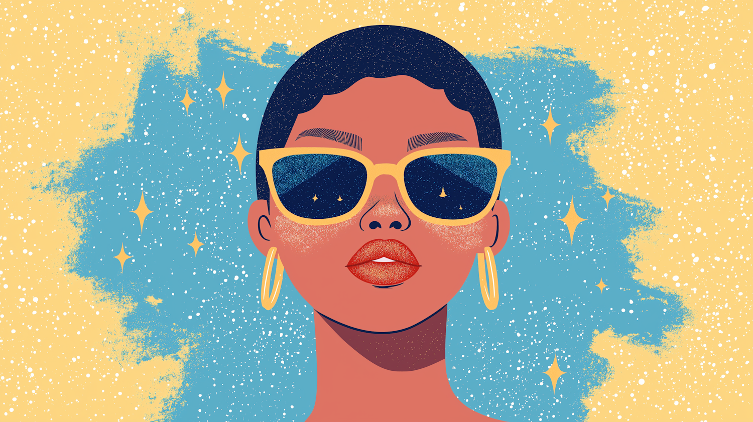 Stylish illustration of a person with yellow sunglasses and hoop earrings against a starry blue and yellow background.