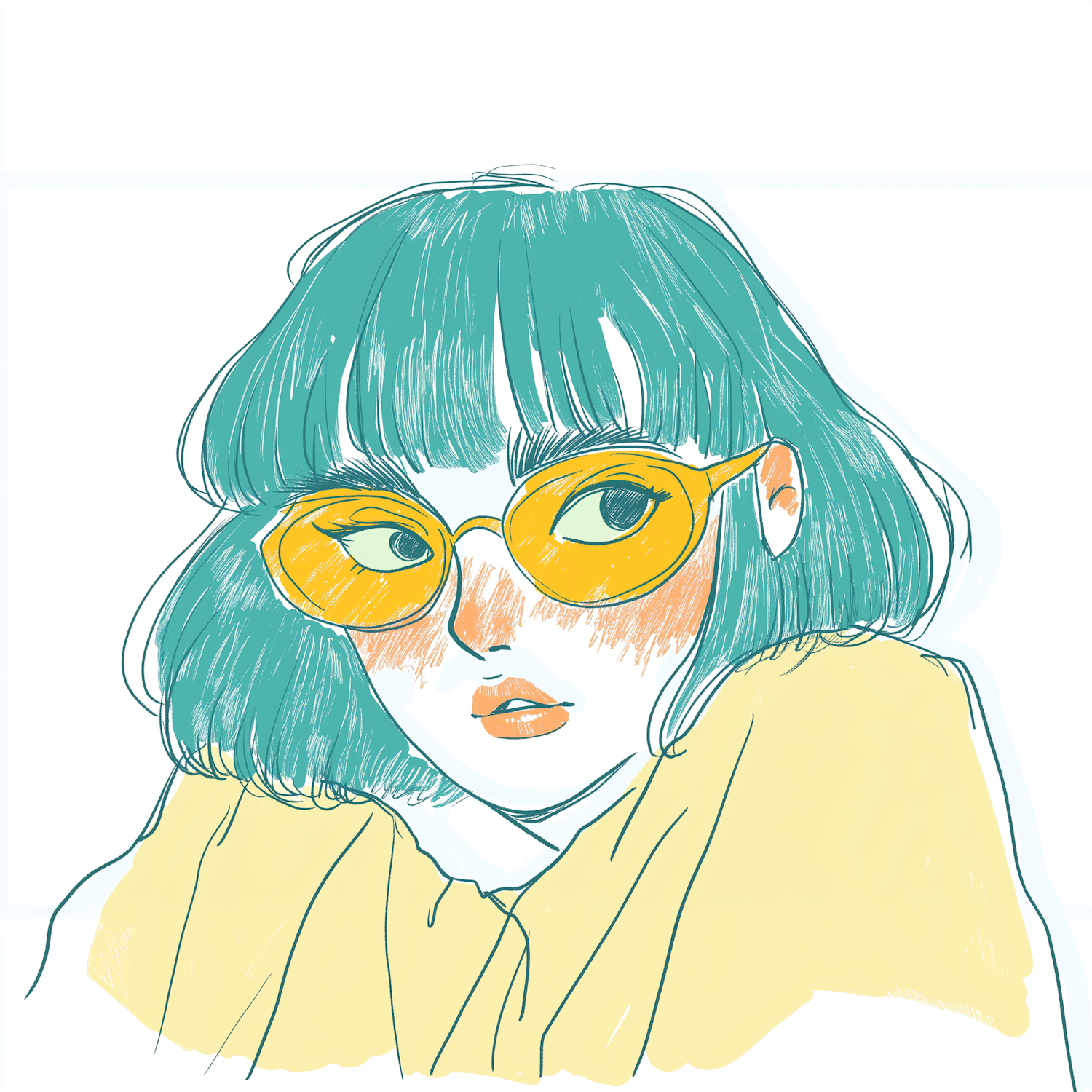 Stylized illustration of a person with teal hair and yellow sunglasses, featuring a sketch-like texture and pastel colors.