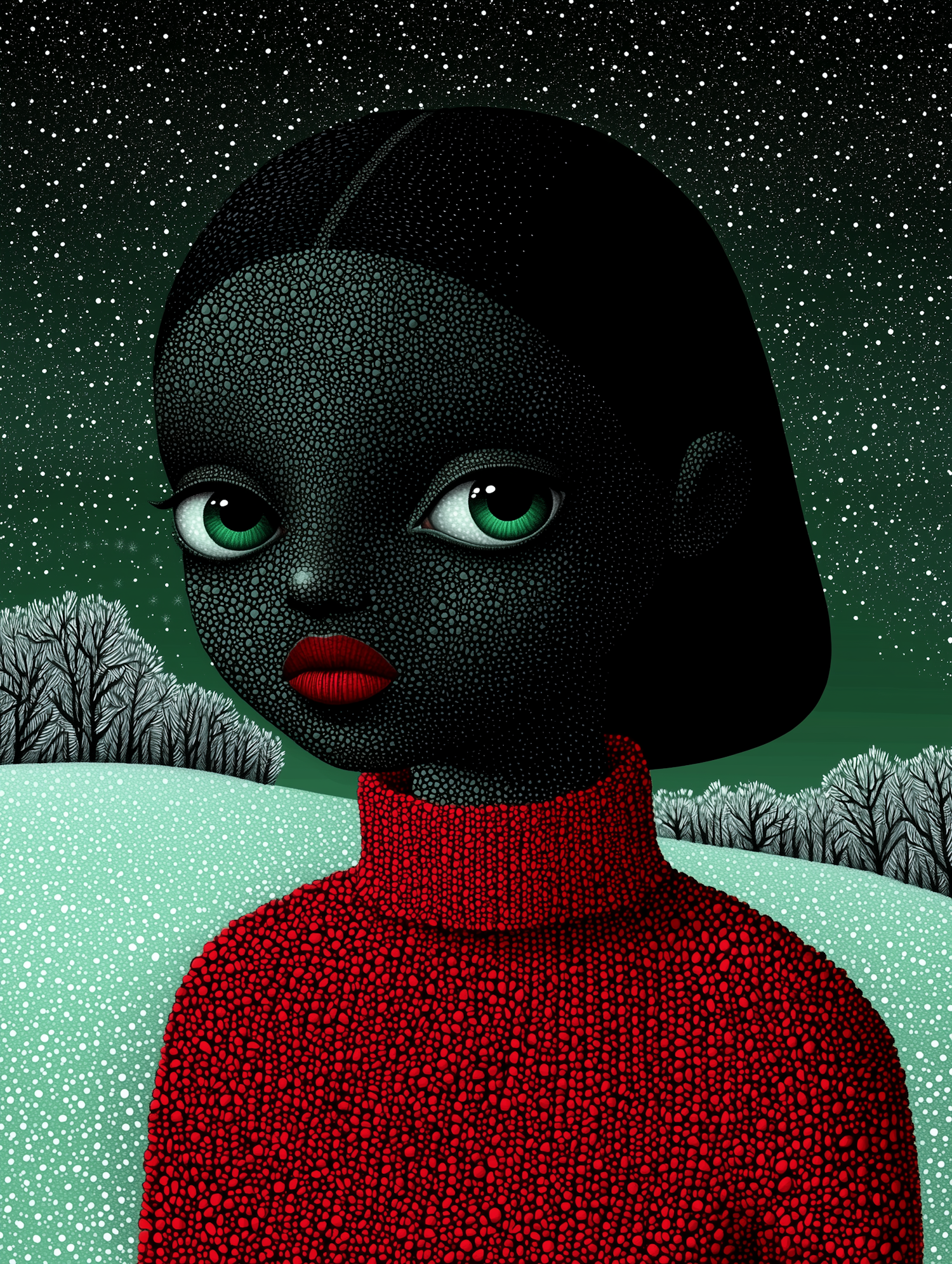 Surreal illustration of a girl with green eyes, red sweater, and snowy landscape under a starry green sky.