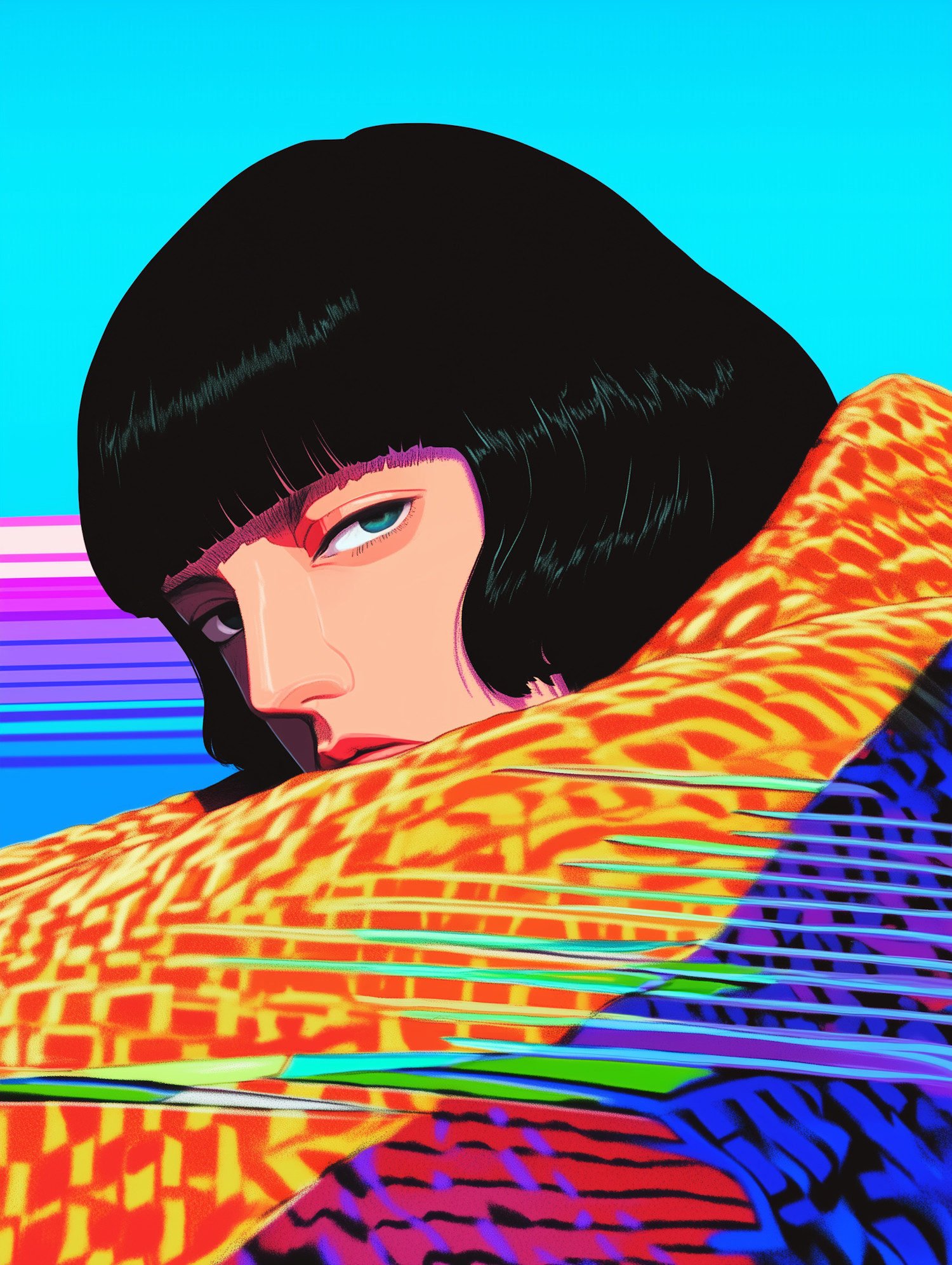 Dynamic digital illustration of a person with a black bob haircut, colorful patterned garment, and intense gaze against a vibrant gradient background.