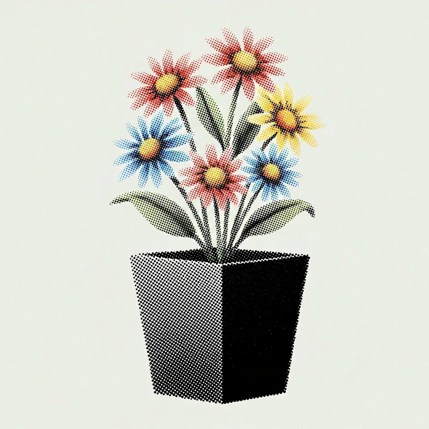 A vibrant halftone illustration of colorful flowers in a black pot, set against a light background for a modern and artistic look.