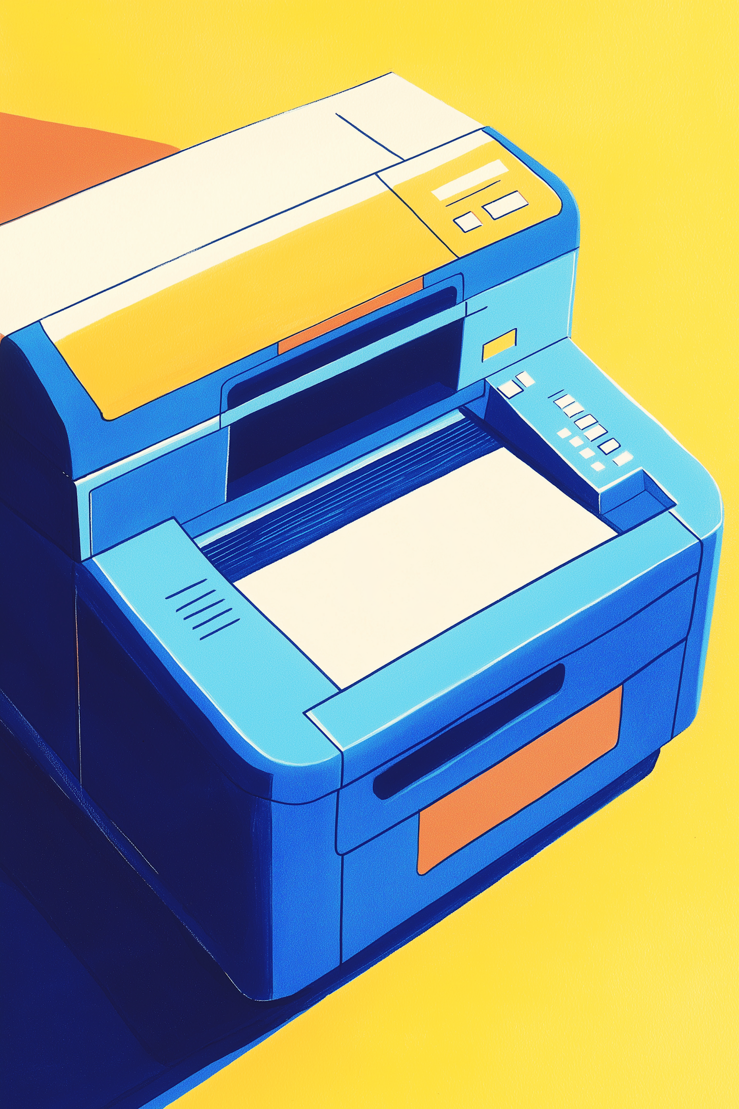 Colorful illustration of a modern printer with bold blue and orange hues on a bright yellow background.