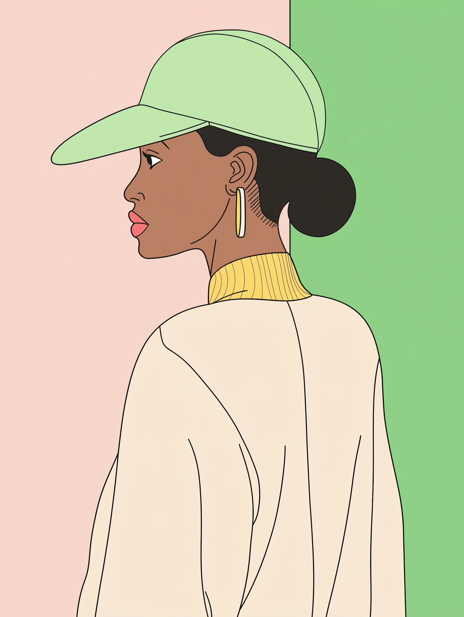 Stylish illustration of a woman in a green cap and cream sweater, set against a pink and green background. Modern and vibrant design.