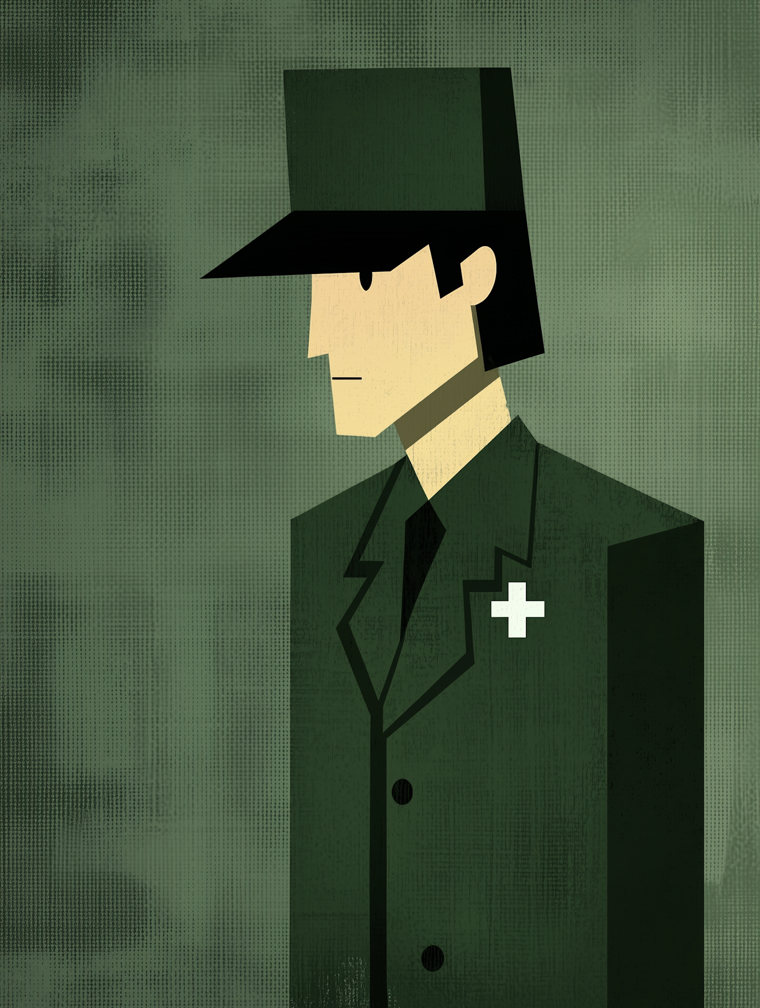 Stylized illustration of a person in a green uniform with a white cross emblem, set against a textured green background.