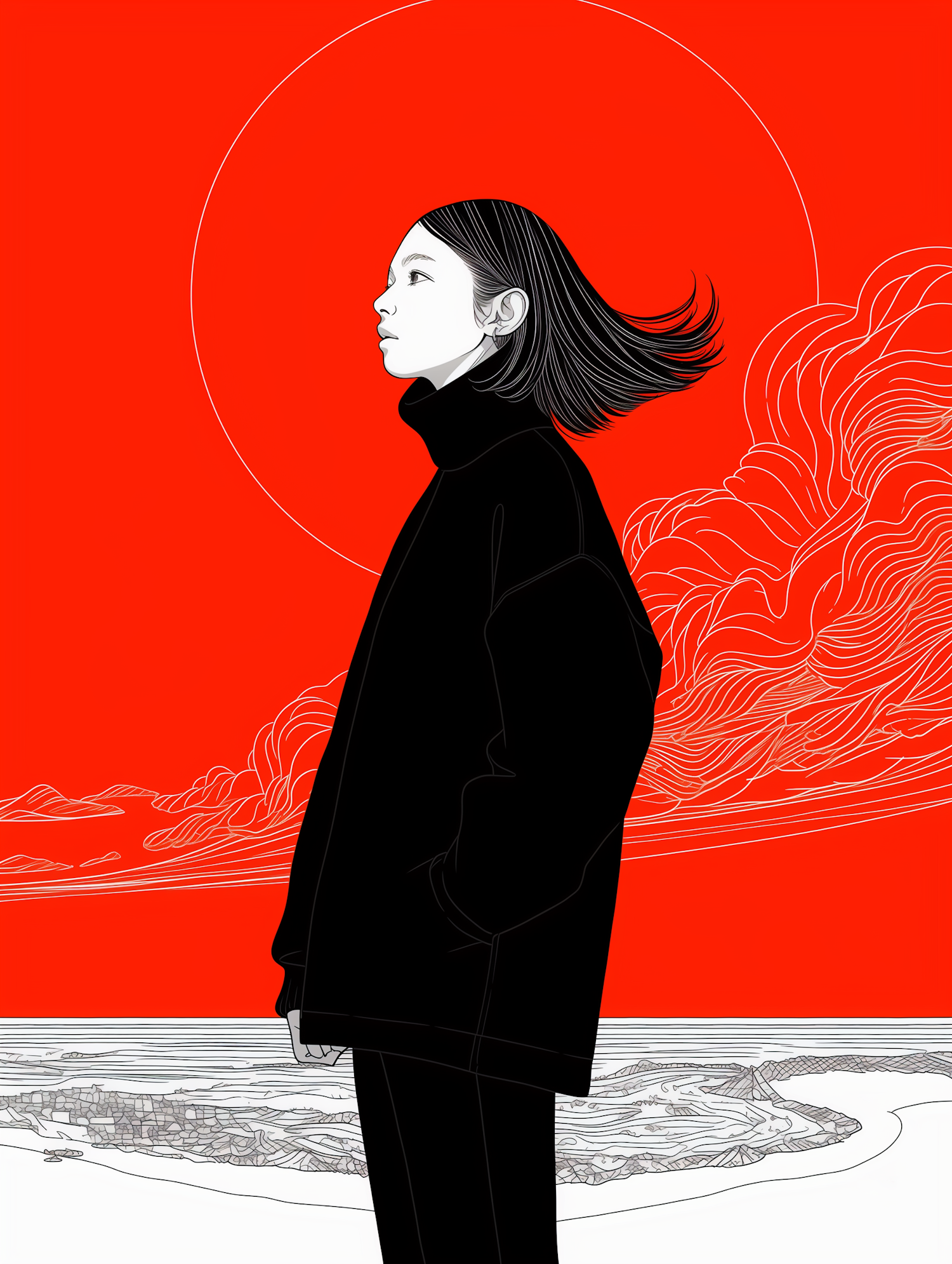 Stylized illustration of a person in profile with a red background, black coat, and flowing hair. Striking red sun and cloud patterns.