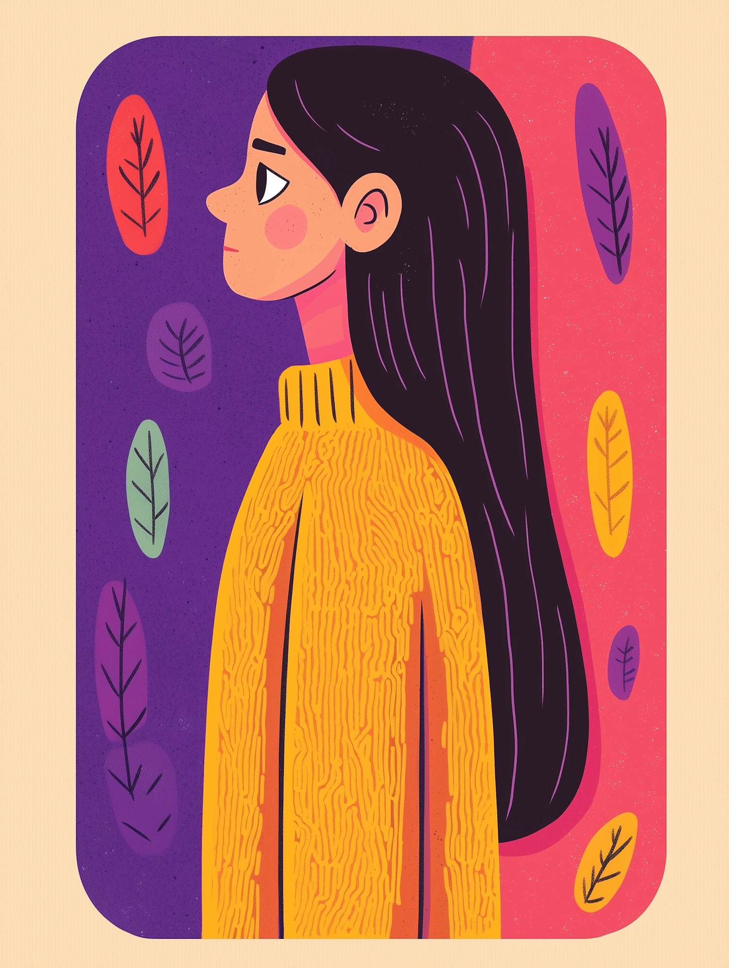 Stylized illustration of a woman in a yellow sweater with colorful leaves on a purple and pink background.