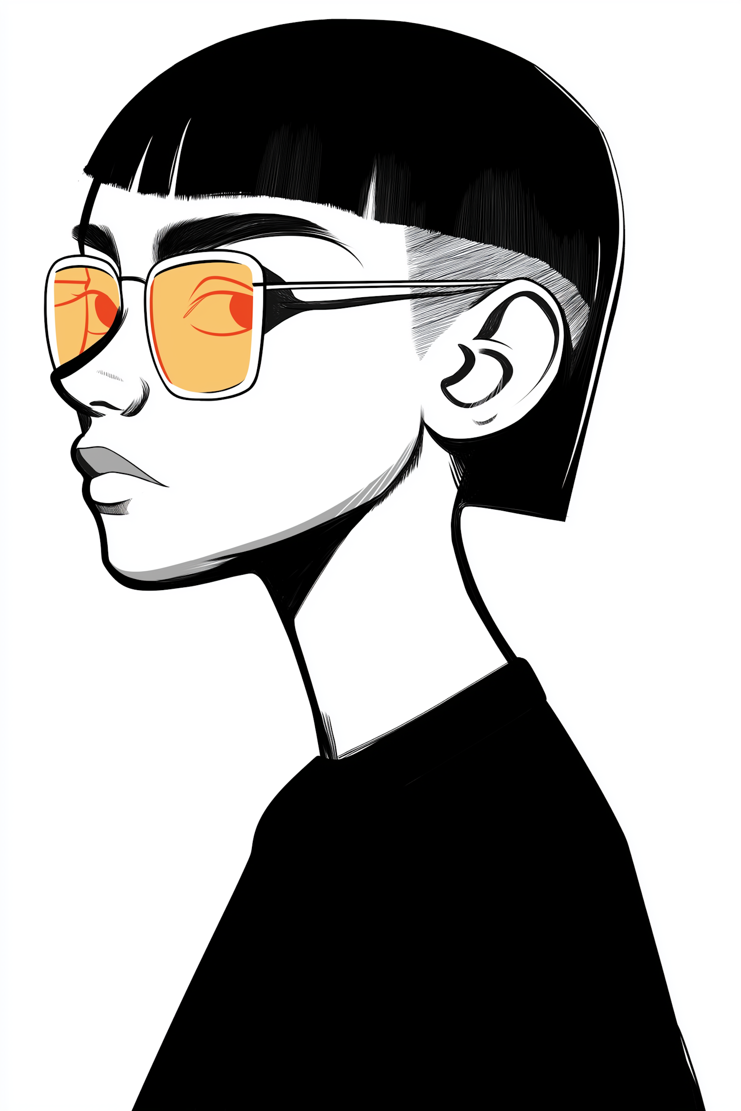 Stylized illustration of a person with short black hair and orange sunglasses, featuring a monochrome palette with bold lines.