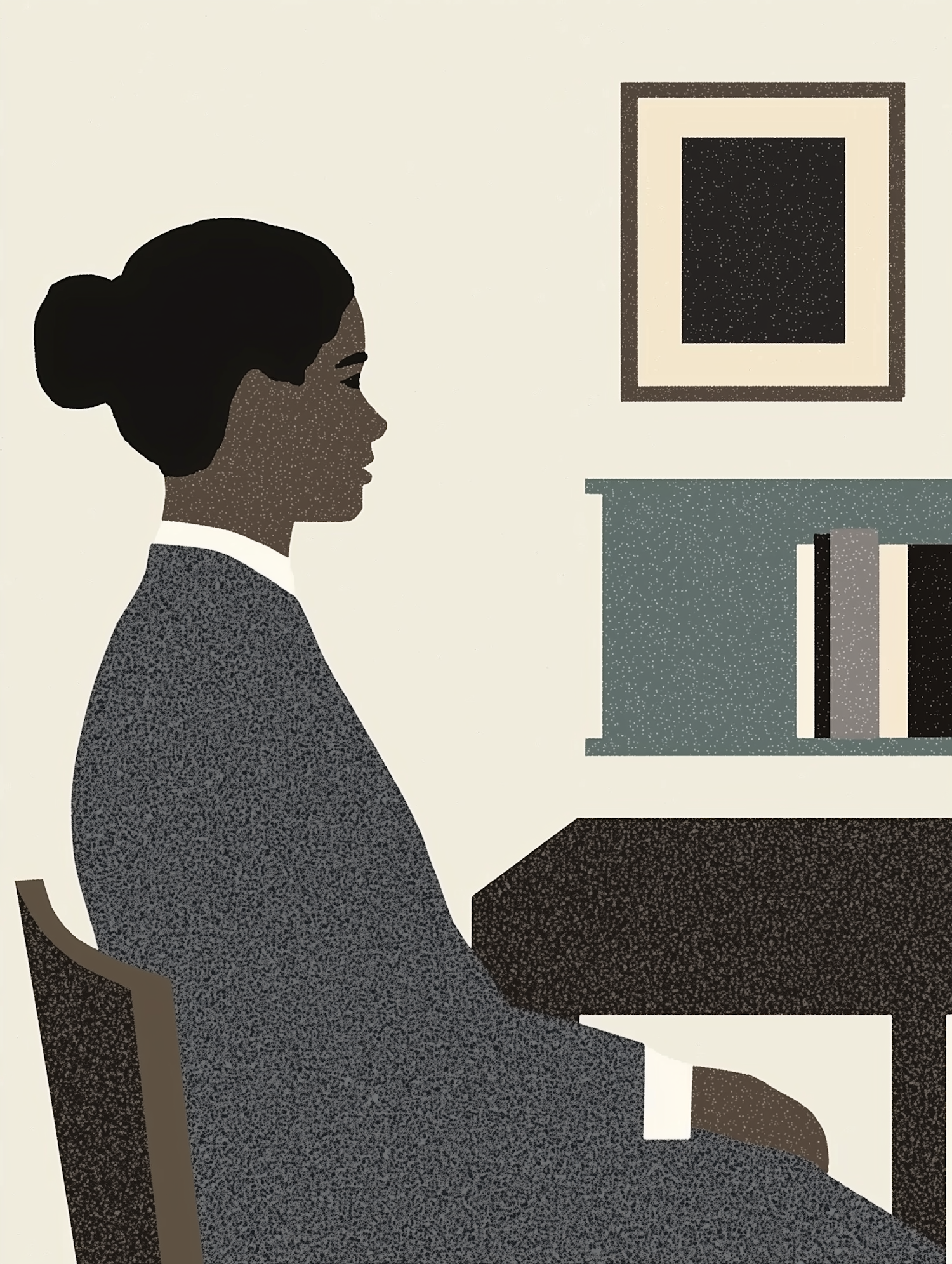 Minimalist illustration of a woman in profile at a desk, with a textured gray outfit and a bun hairstyle, set against a beige background.