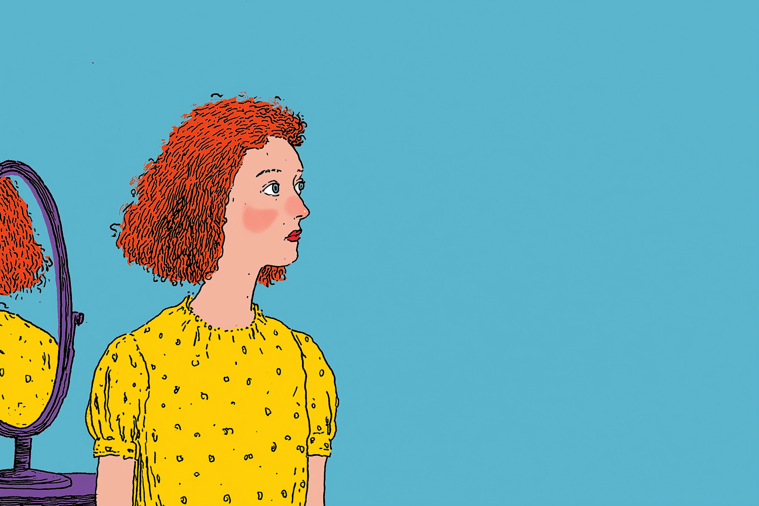Illustration of a person with red curly hair in a yellow shirt, gazing sideways with a mirror reflection, set against a blue background.