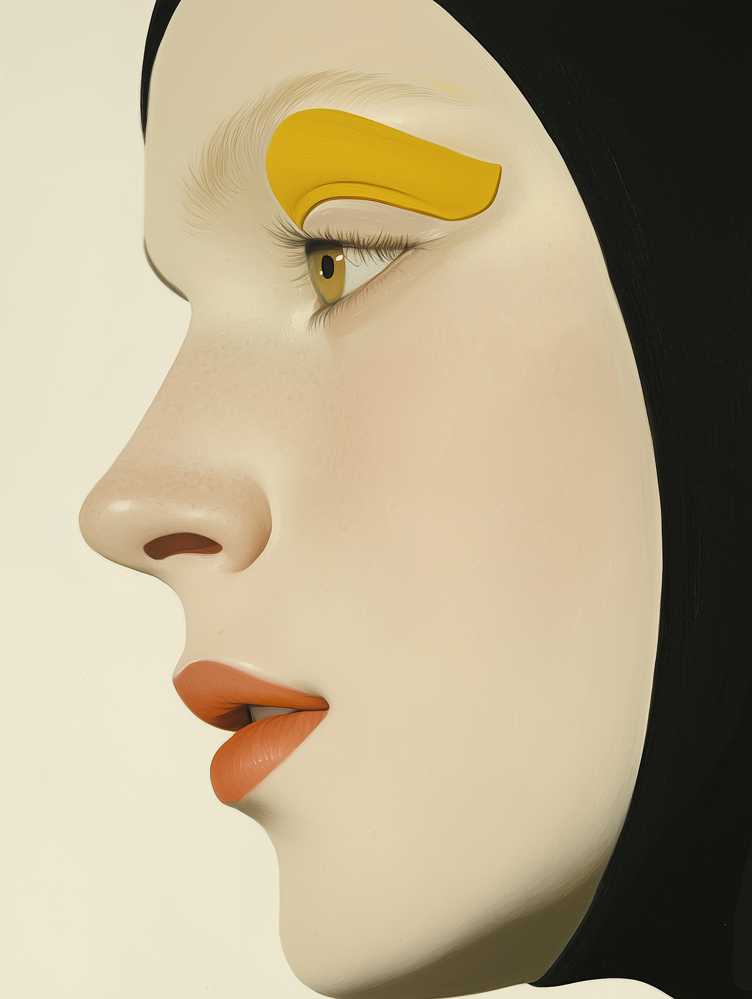 Stylized side profile with yellow eyebrow, orange lips, and black head covering. Minimalist and modern artistic composition.