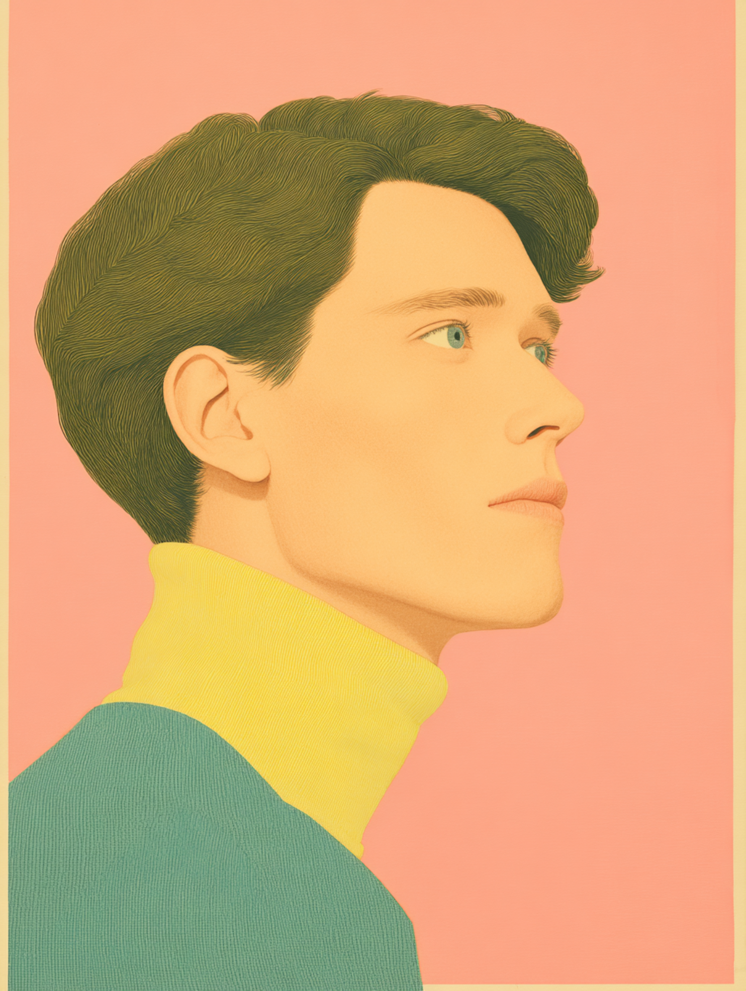 Stylized illustration of a young man in a yellow turtleneck and teal sweater, set against a pastel pink background.