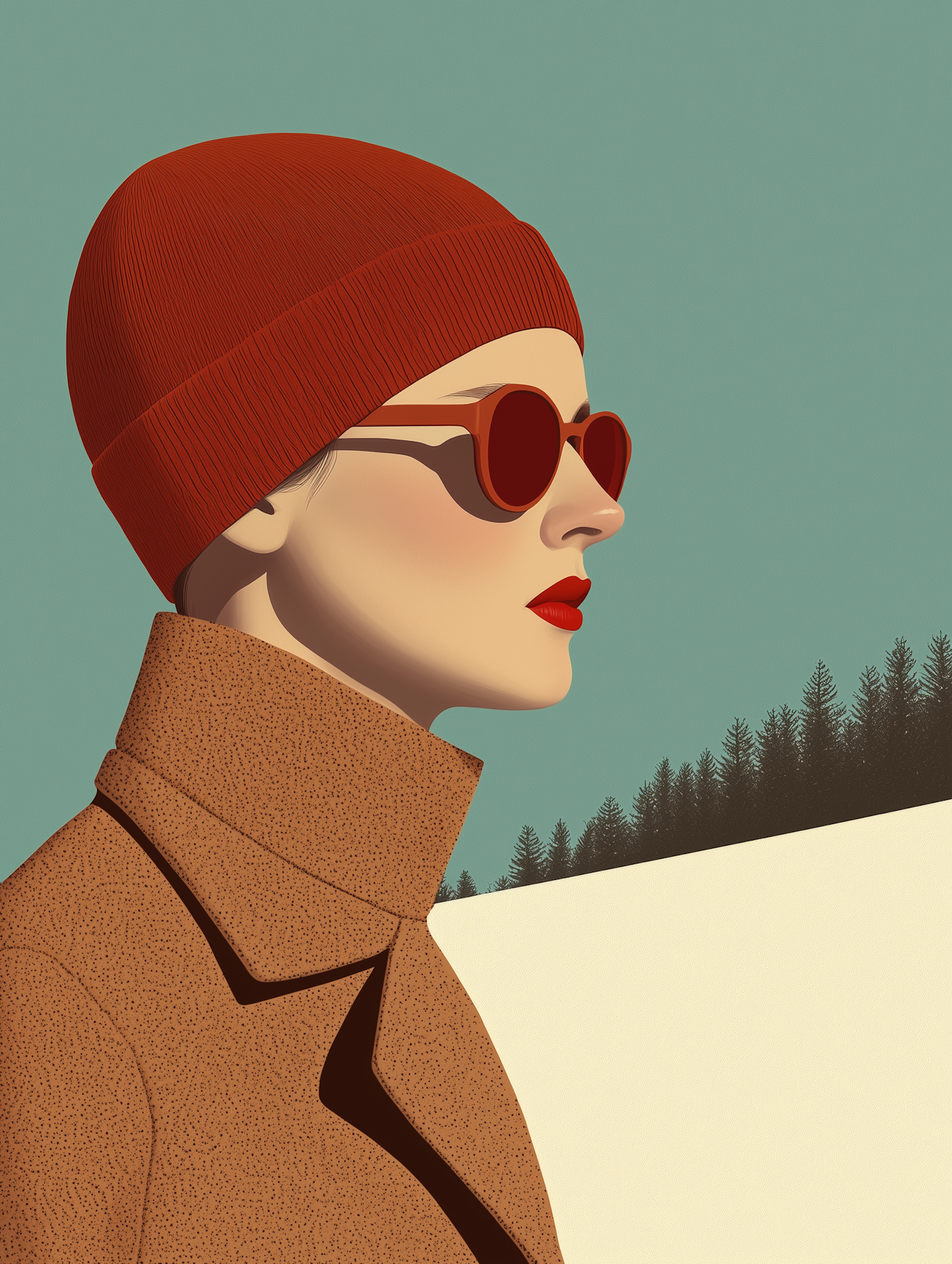 Stylized illustration of a person in a red beanie and brown coat against a serene landscape with teal sky and dark green trees.