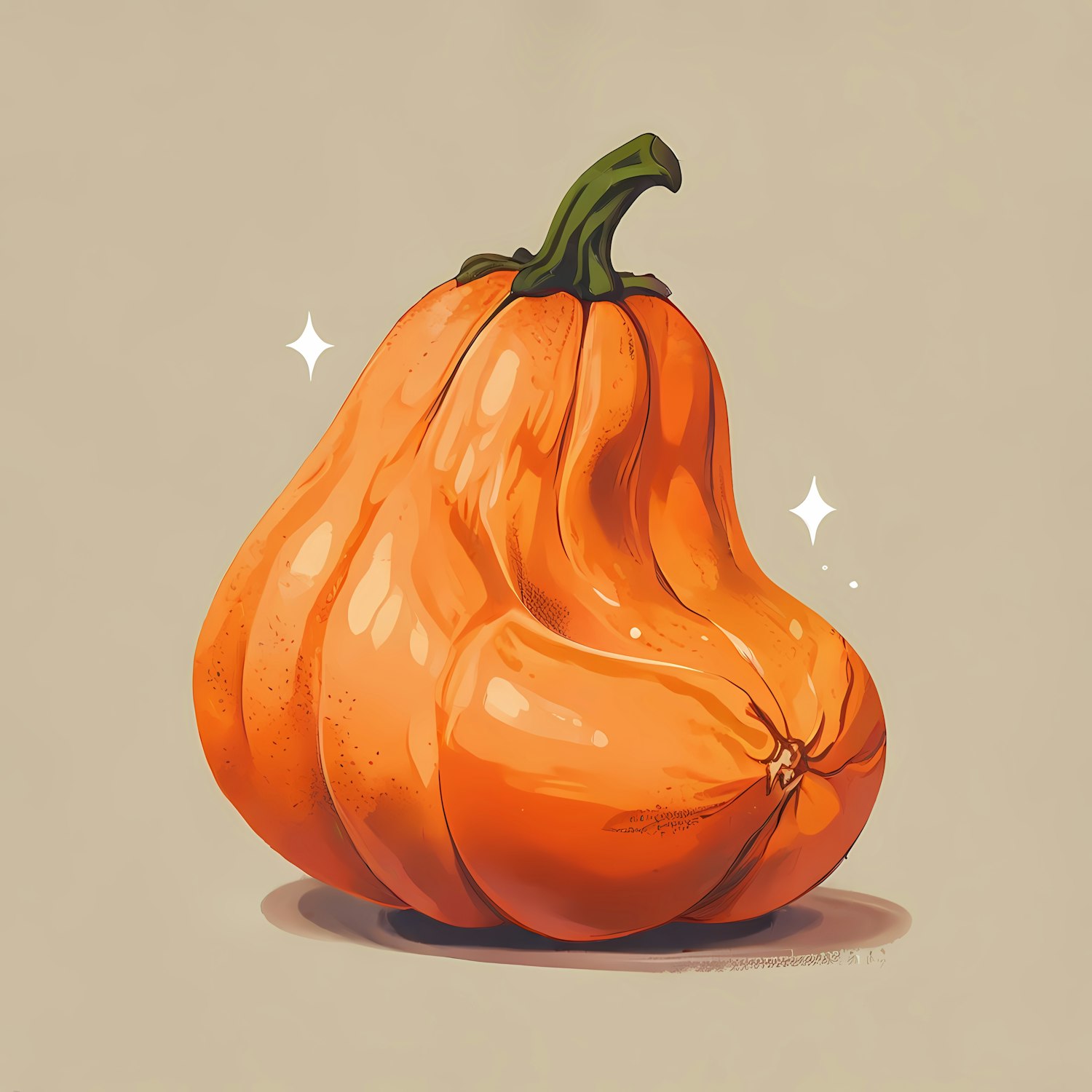 Whimsical illustration of a shiny, irregularly shaped orange pumpkin with sparkles, set against a soft beige background.