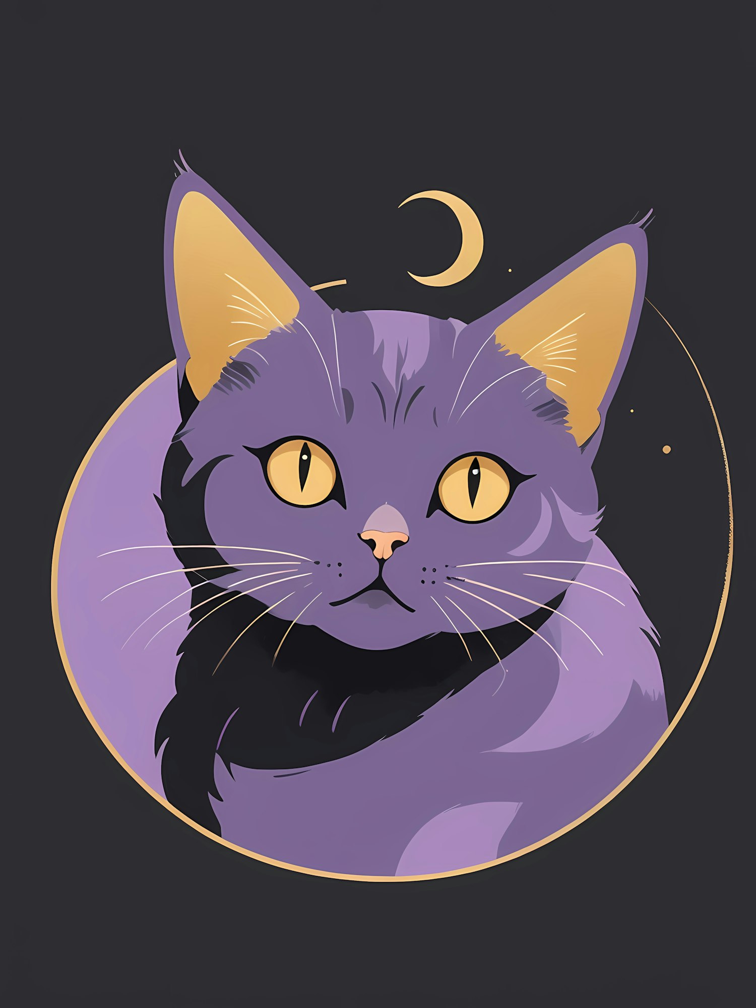 Mystical purple cat illustration with golden eyes, crescent moon, and stars on a dark background. Enchanting and celestial theme.
