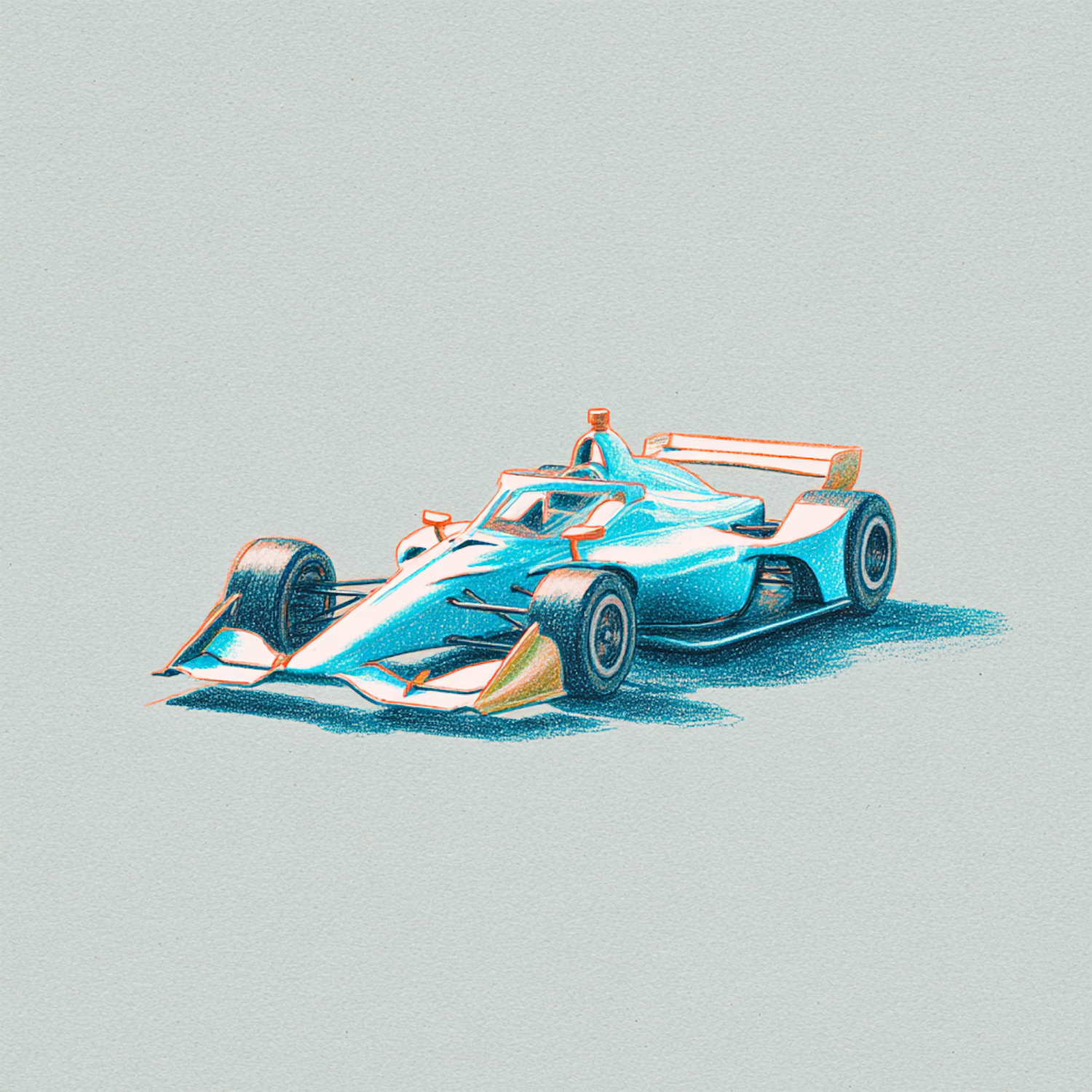 Stylized illustration of a sleek blue race car with orange accents, showcasing a modern aerodynamic design on a light gray background.