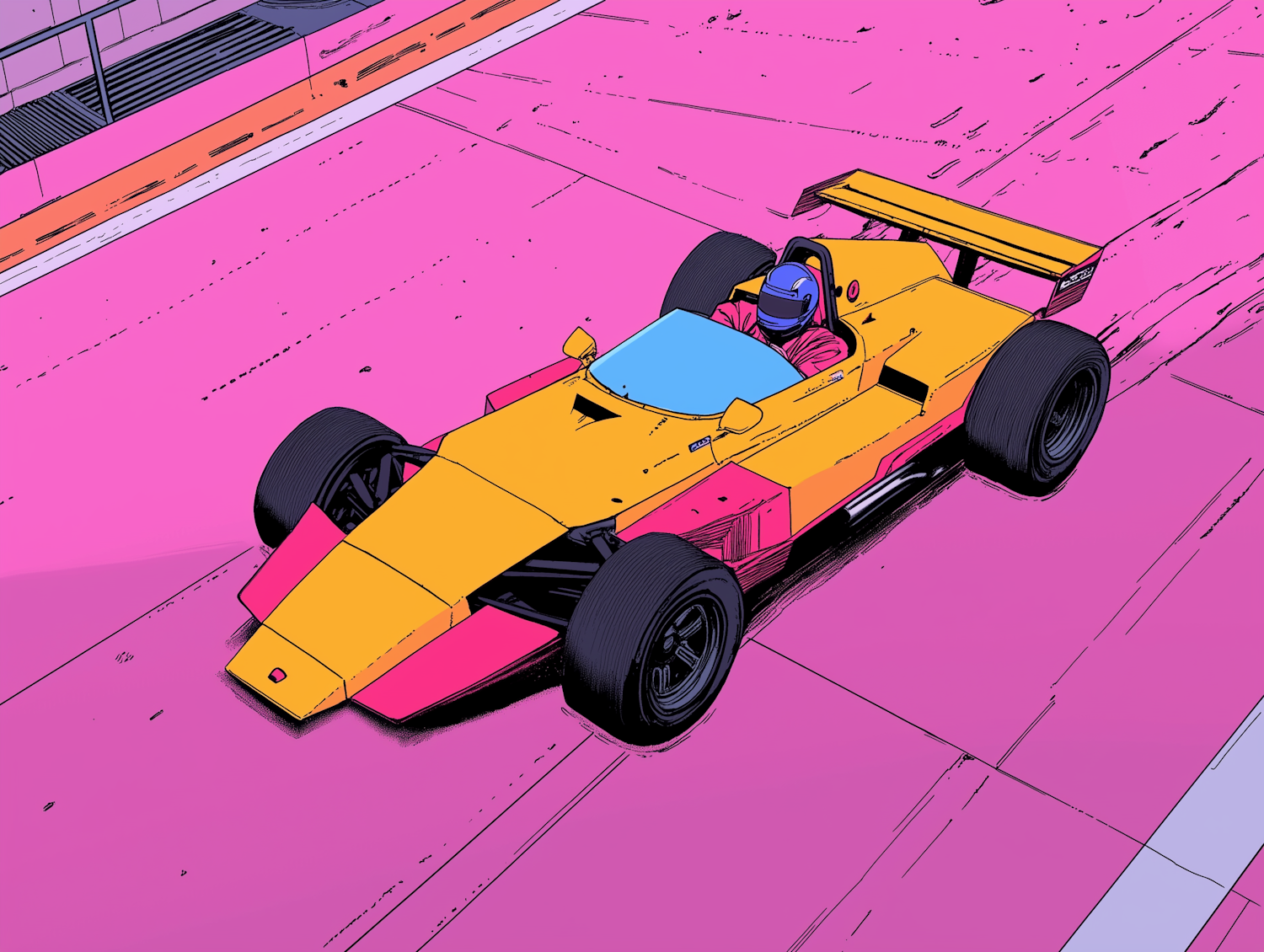 Vibrant illustration of a yellow and pink Formula 1 car on a pink track, with a driver in a blue helmet and pink suit.