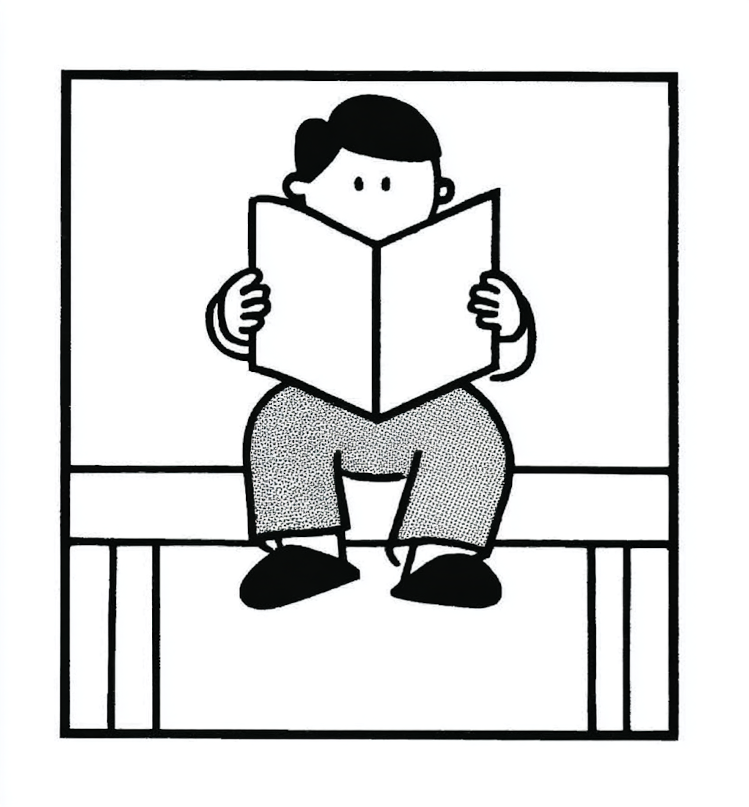 Minimalist black-and-white illustration of a person reading a book while sitting on a bench, with simple geometric design elements.
