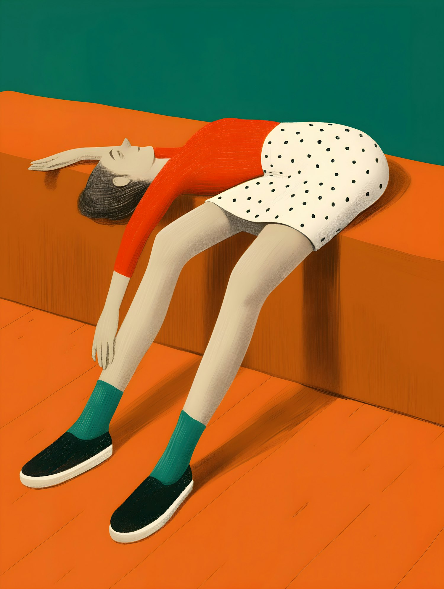 Stylized illustration of a person reclining on an orange surface, wearing a red top, polka-dot skirt, teal socks, and black shoes.