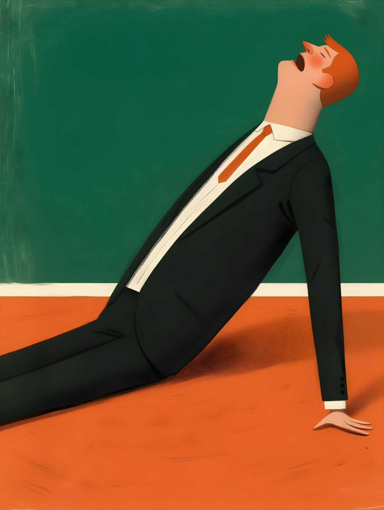 Stylized illustration of a man in a suit reclining on an orange floor with a green background, showcasing bold colors and expressive posture.