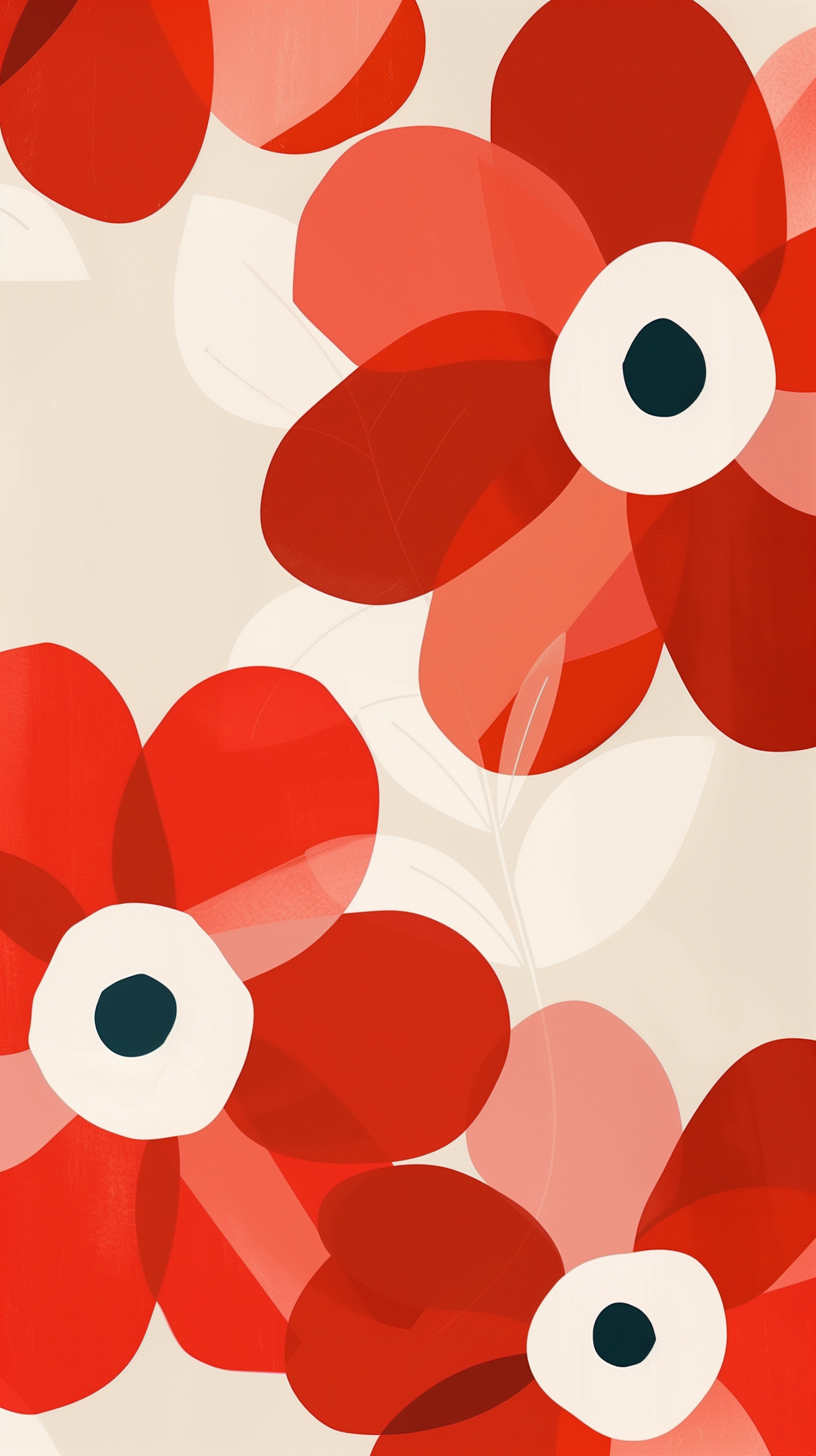 Bold red flowers with layered petals and dark centers on a beige background, accented by subtle white leaves for a modern, artistic look.
