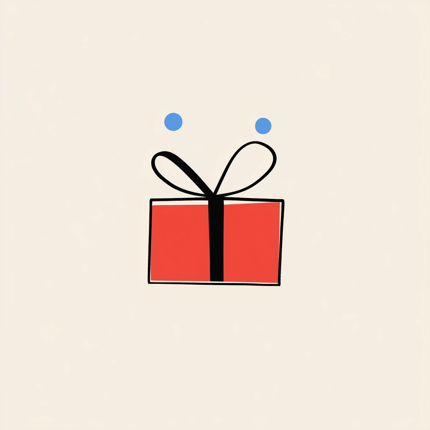 Minimalist illustration of a red gift box with a black ribbon and two blue dots on a beige background.