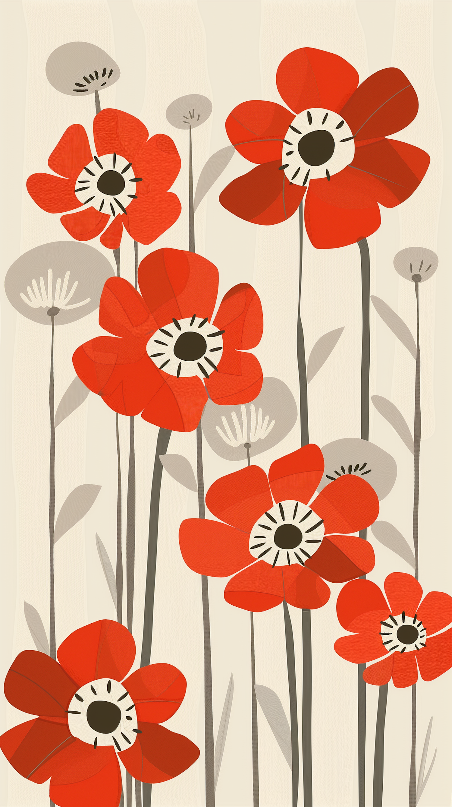 Stylized red poppies with bold black and white centers on a beige background, featuring a modern, minimalistic design with muted gray accents.