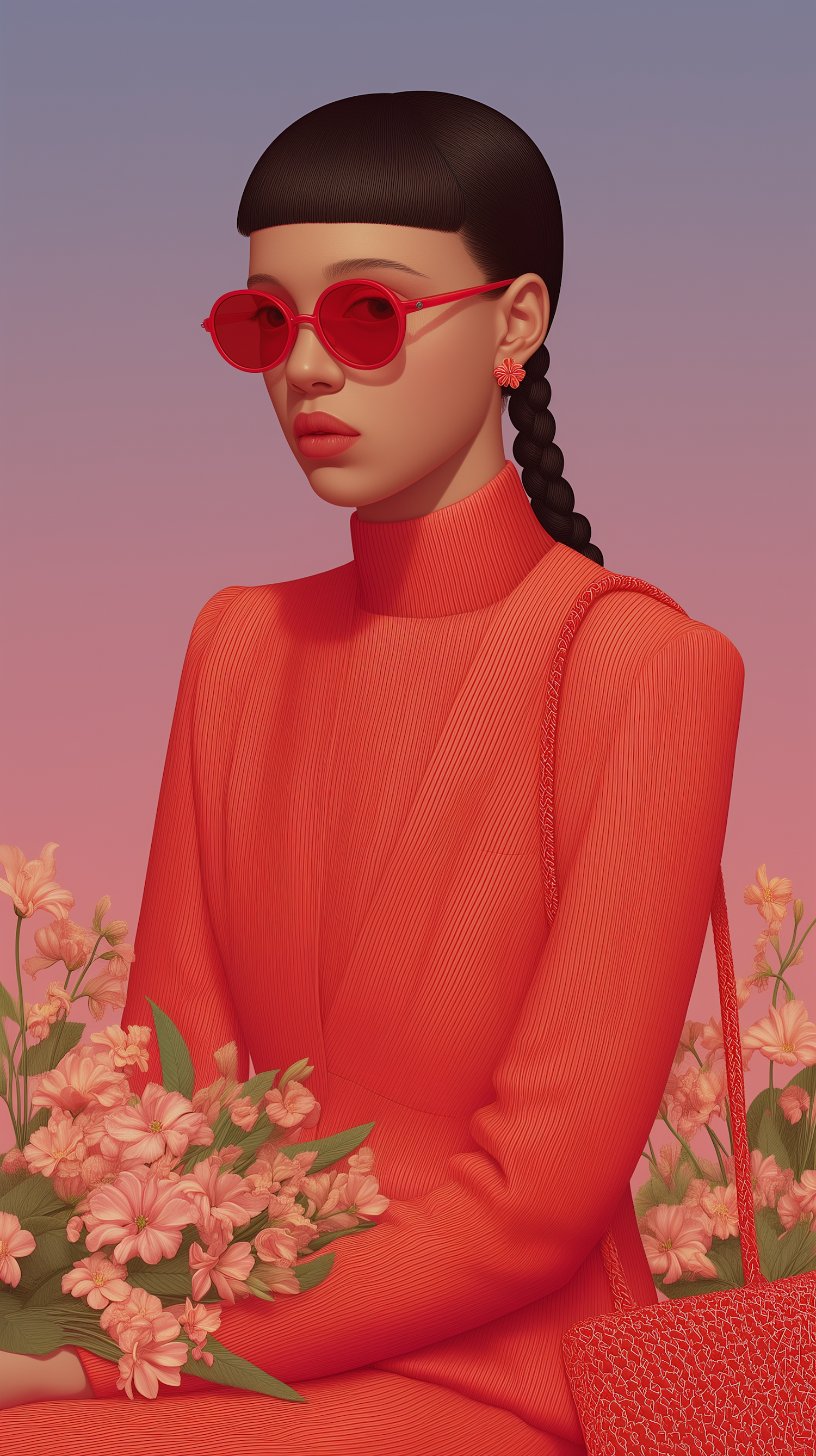 Stylized portrait of a person in red attire with pink flowers, set against a soft gradient background.