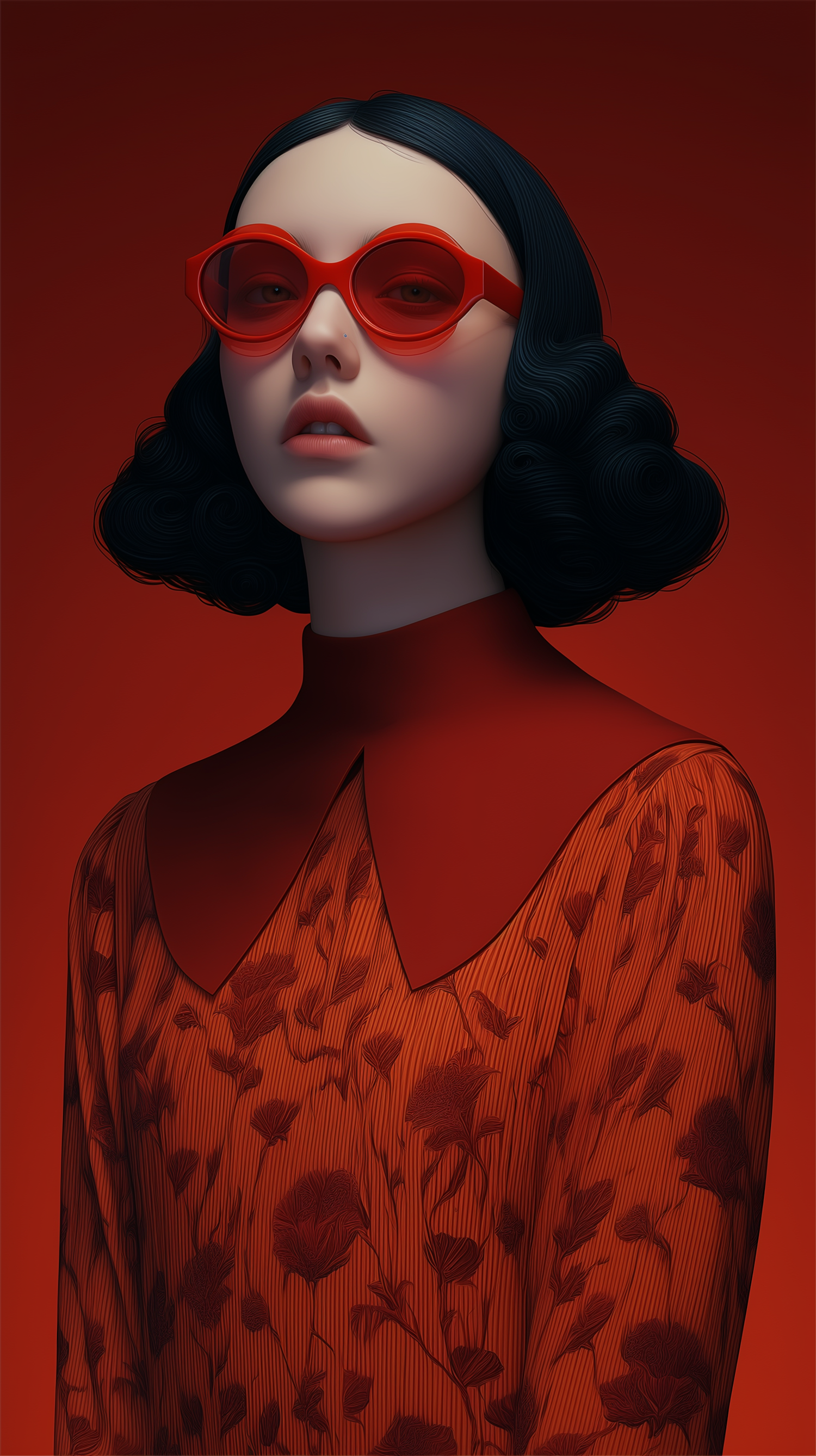 Stylized portrait of a person with red glasses and floral attire against a red background, showcasing bold colors and artistic design.