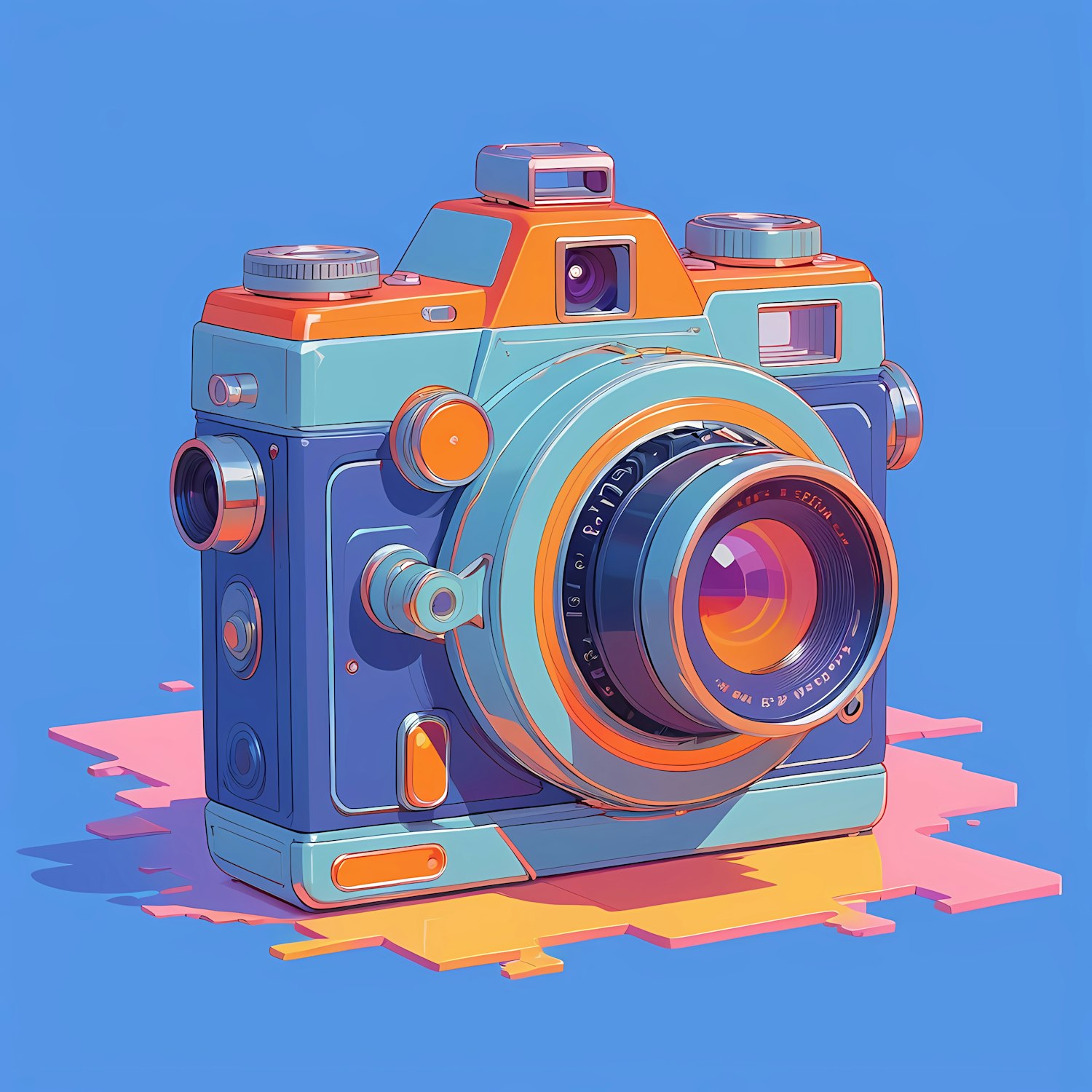 Stylized retro camera illustration with bold orange, blue, and pink tones, featuring intricate details and a modern artistic flair.