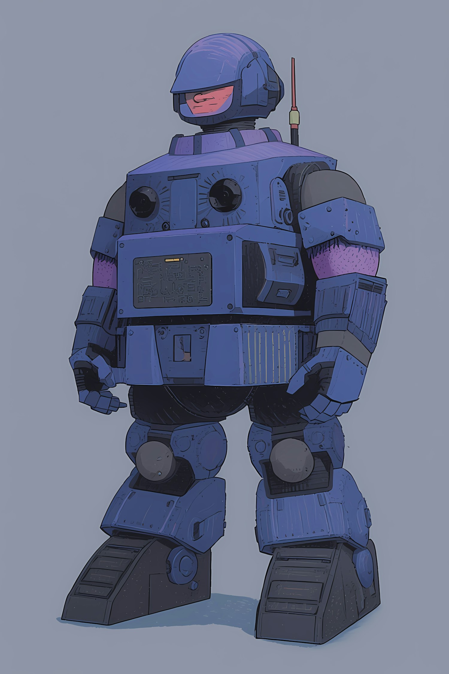 Stylized illustration of a blue humanoid robot with a retro-futuristic design, featuring segmented limbs and a helmet-like head.