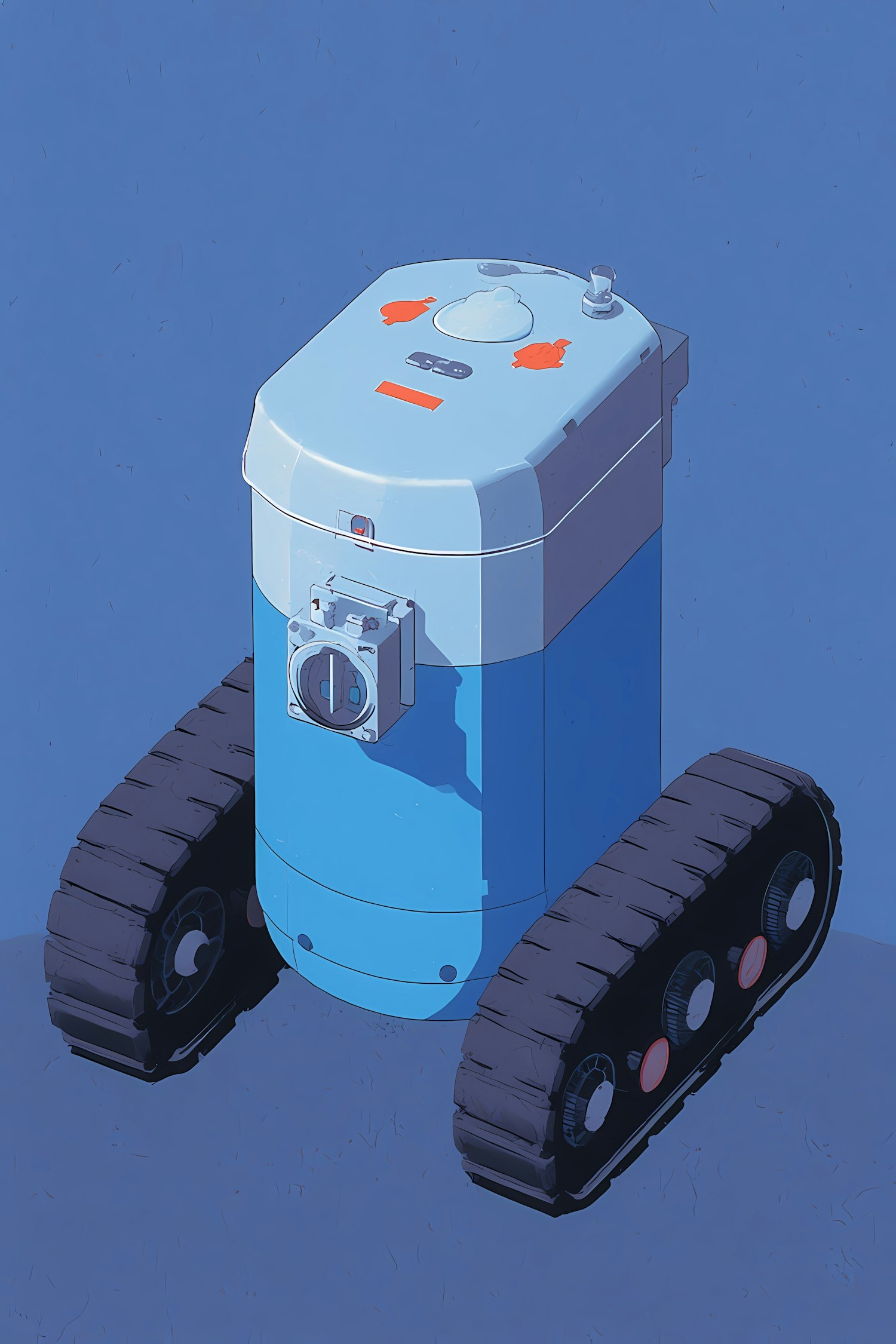 A stylized robot with a blue and white body and tank-like treads, set against a solid blue background, showcasing a futuristic design.