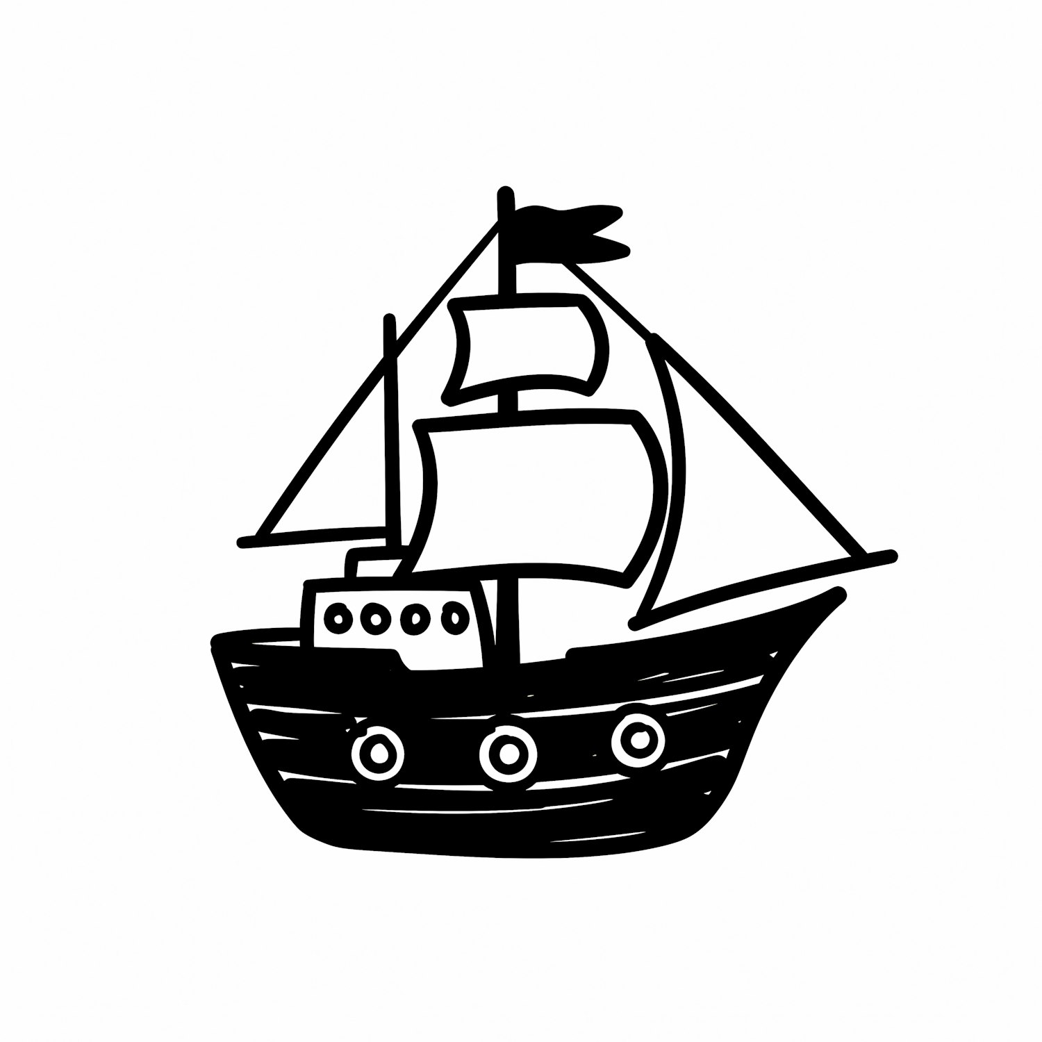 Stylized black and white illustration of a sailing ship with bold lines and minimalistic design, perfect for nautical-themed projects.