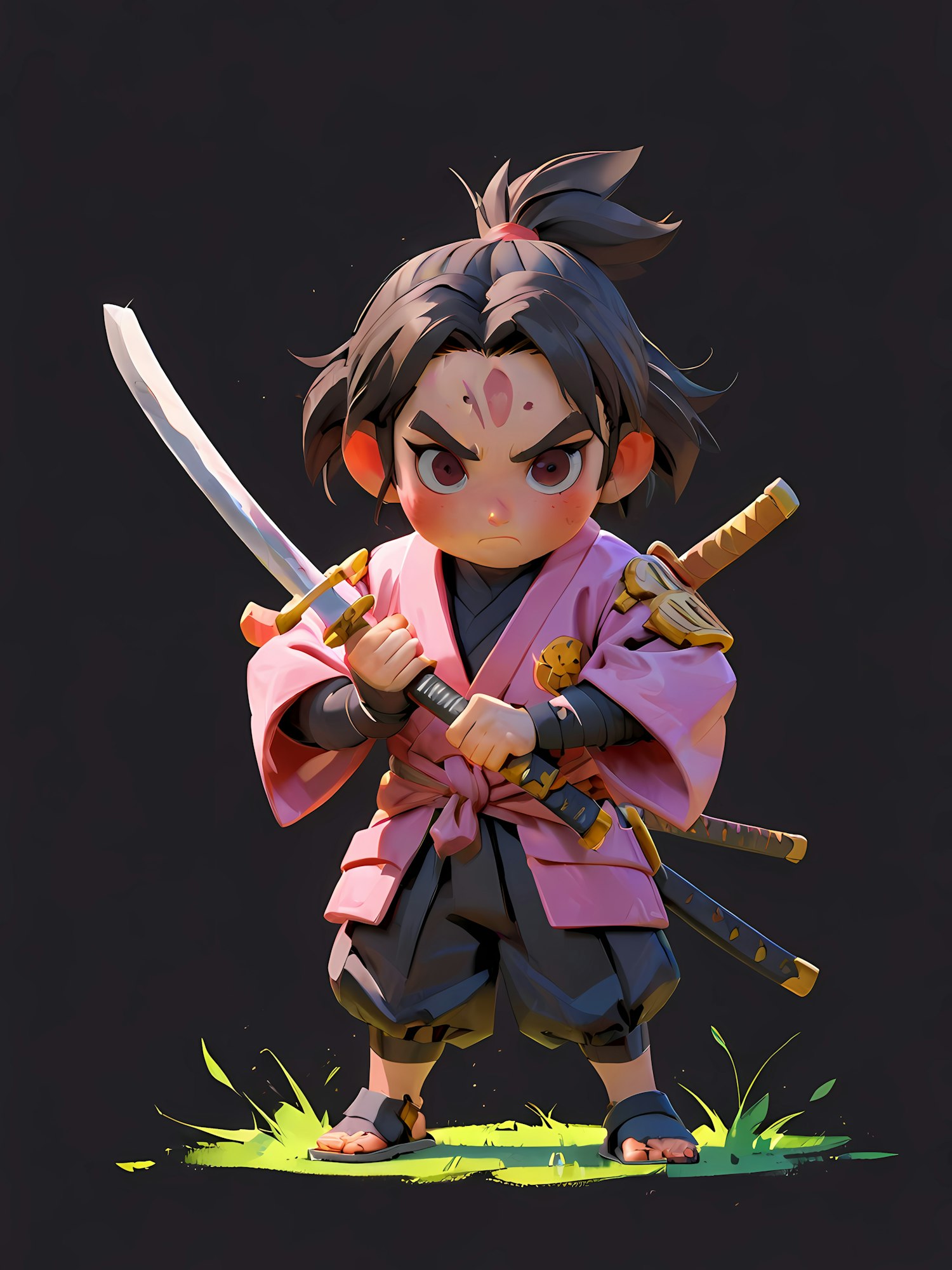 Stylized 3D samurai character with a pink kimono, black pants, and dual swords, standing on vibrant grass against a dark background.