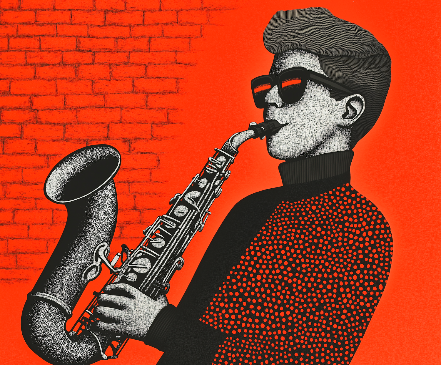 Stylized pop art illustration of a saxophone player in sunglasses against a vibrant orange background with a brick pattern.