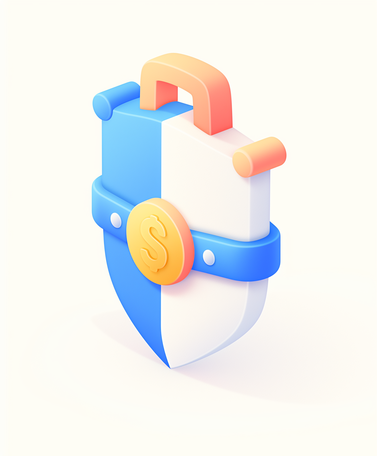 3D illustration of a shield with a lock and dollar sign, symbolizing financial security. Modern design with blue, white, and orange hues.