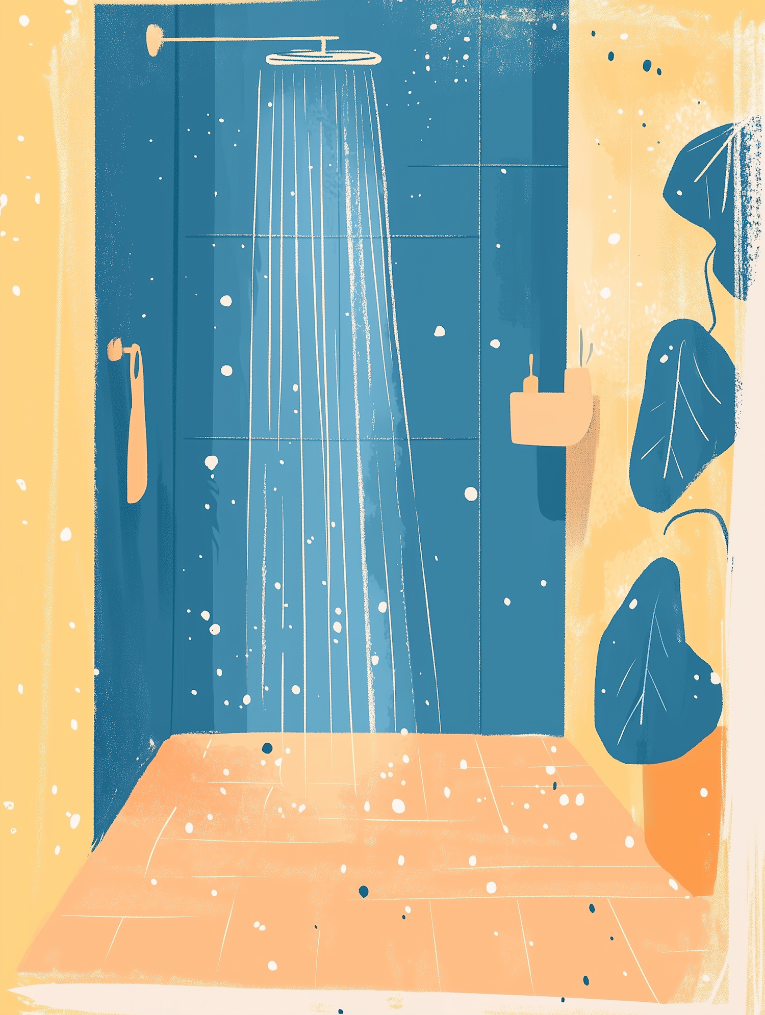 Stylized illustration of a modern shower with blue and yellow tones, featuring a large showerhead and abstract leaves.