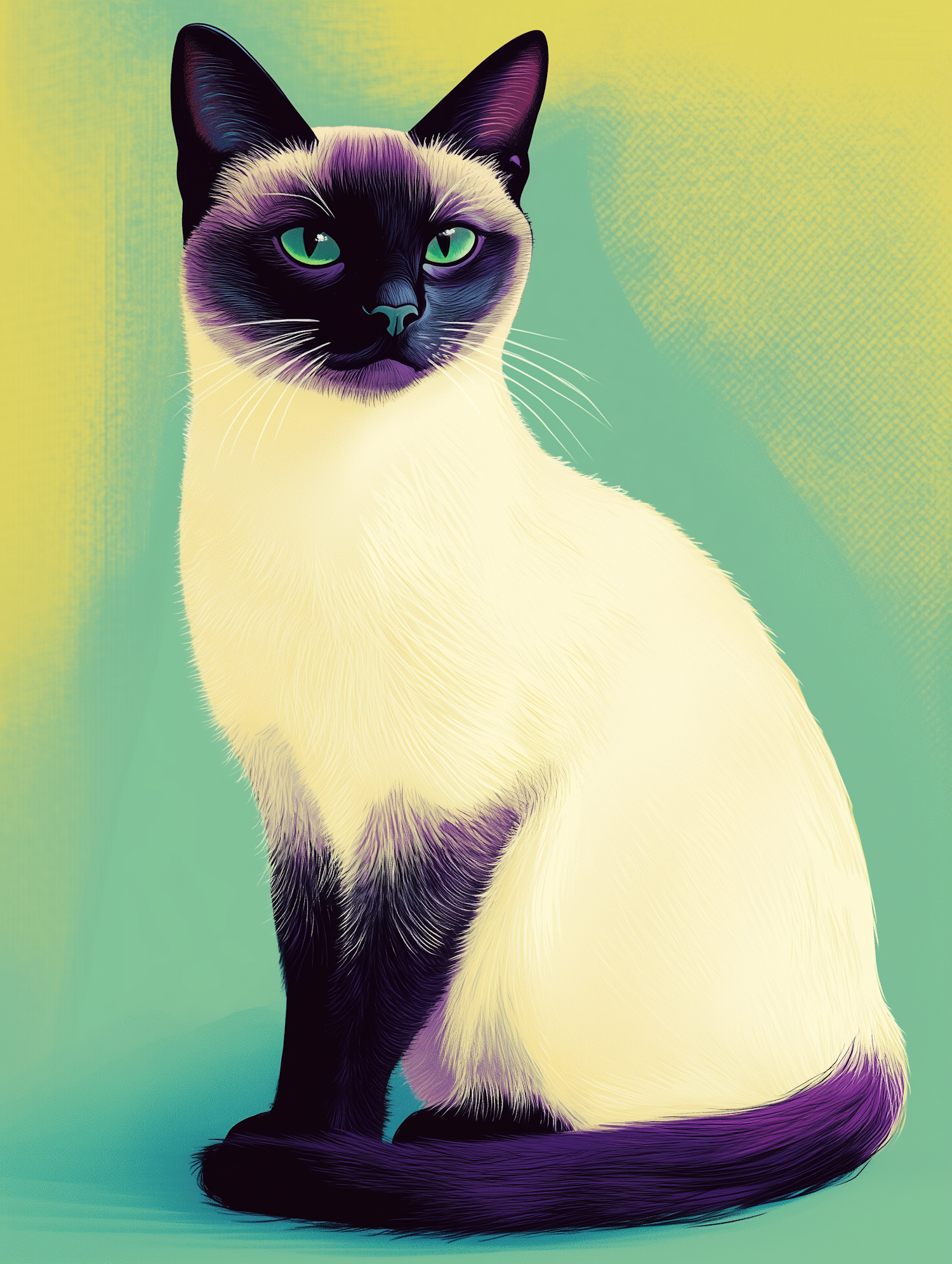 Stylized Siamese cat illustration with green eyes, cream fur, and dark accents. Vibrant teal and yellow background adds a modern touch.