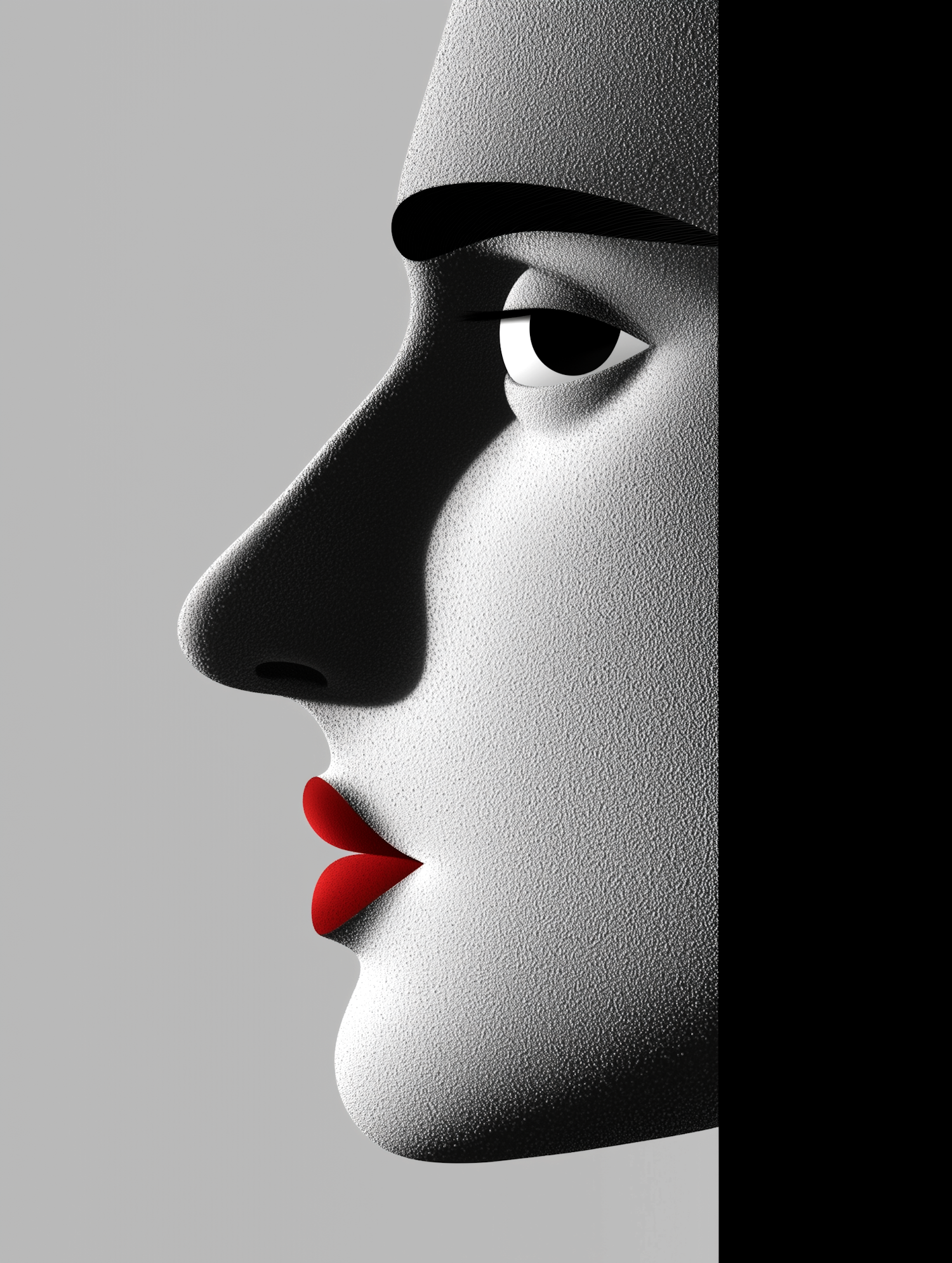 Stylized profile illustration with textured gray face, bold red lips, and striking black eye. Minimalist and geometric design.