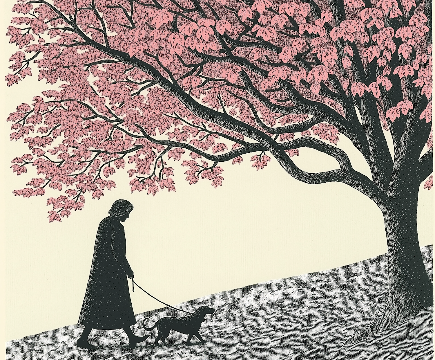 Illustration of a person walking a dog under a pink-leaved tree, creating a serene and peaceful atmosphere.