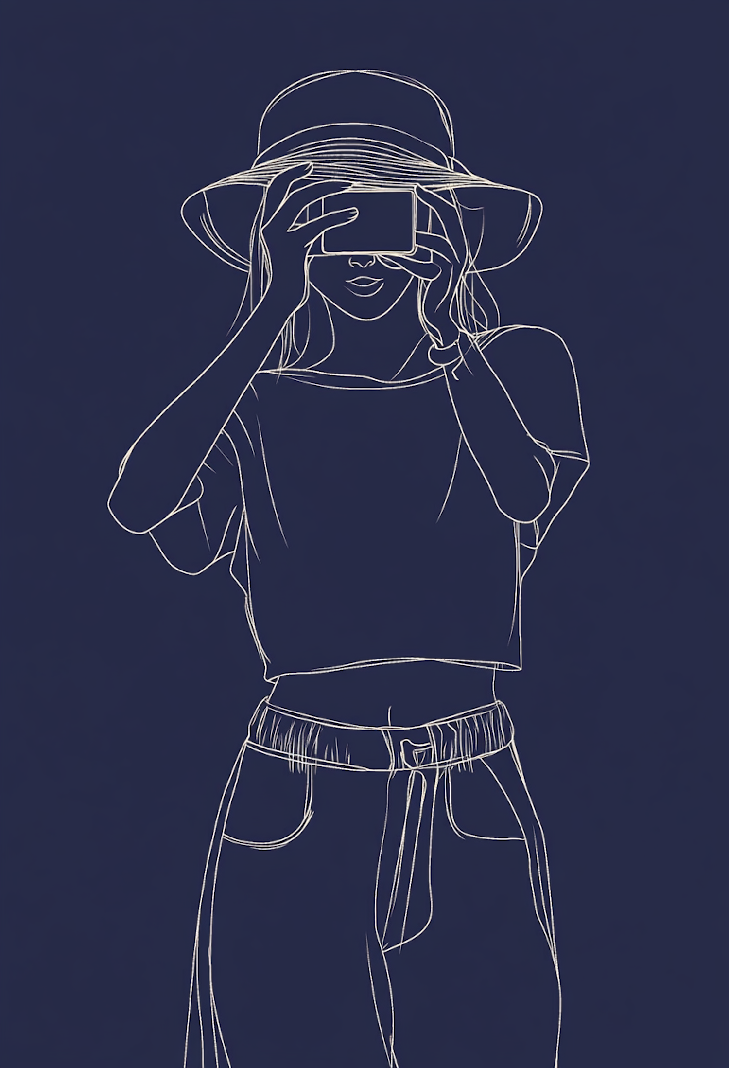 Minimalist line art of a person with a camera, wearing a hat, on a dark blue background. Simple and elegant design.