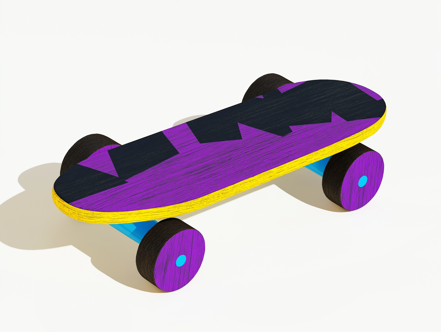 Vibrant skateboard with purple zigzag design, yellow edges, and blue trucks. Perfect for a stylish ride.