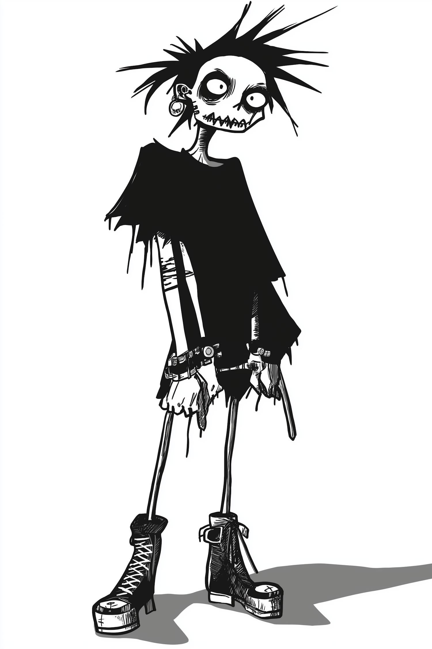 Gothic punk character illustration with spiky hair, stitched mouth, and heavy boots. Black and white cartoon style with exaggerated features.