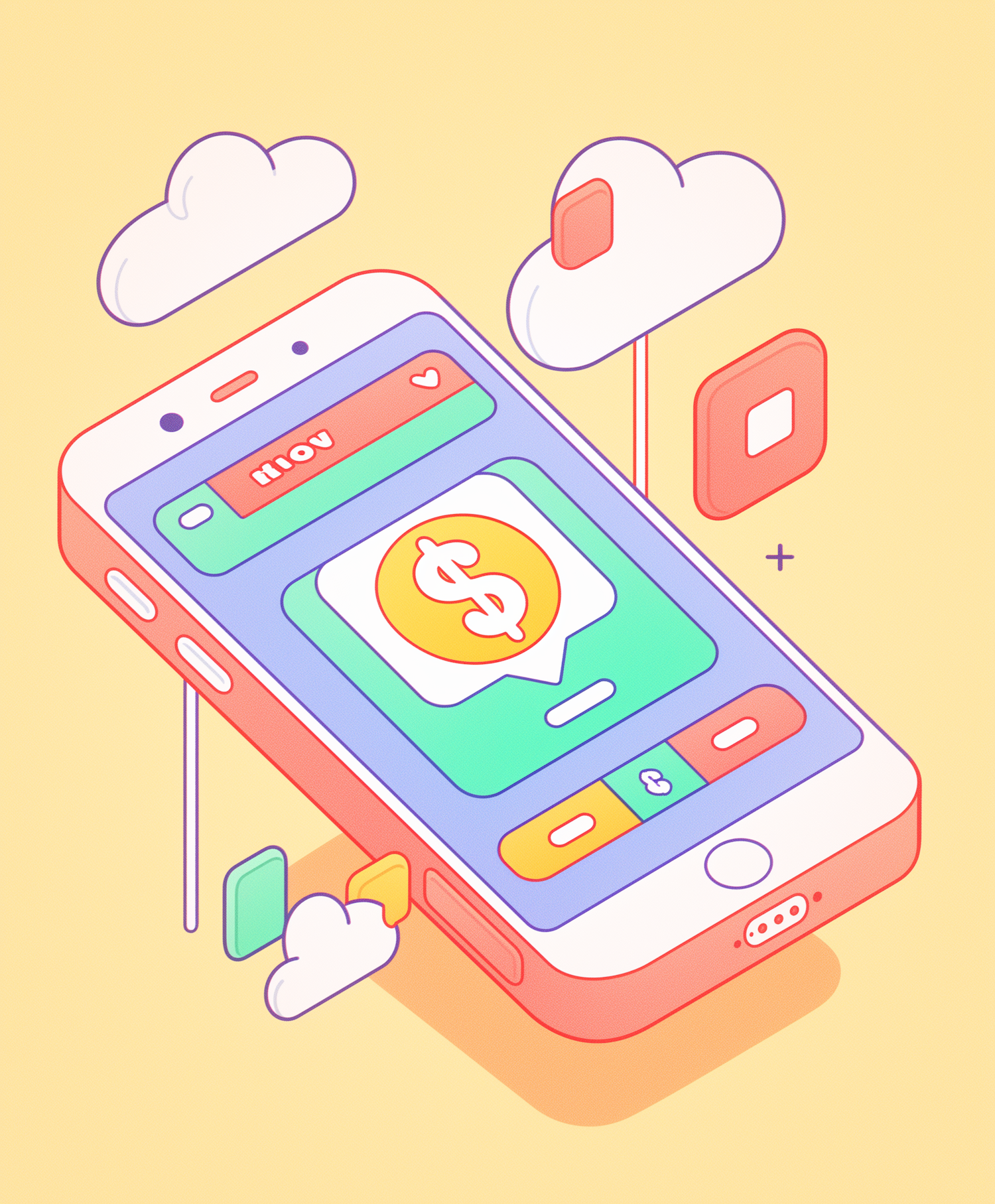 Stylized illustration of a smartphone with a dollar sign, symbolizing mobile banking, surrounded by cloud icons on a pastel background.